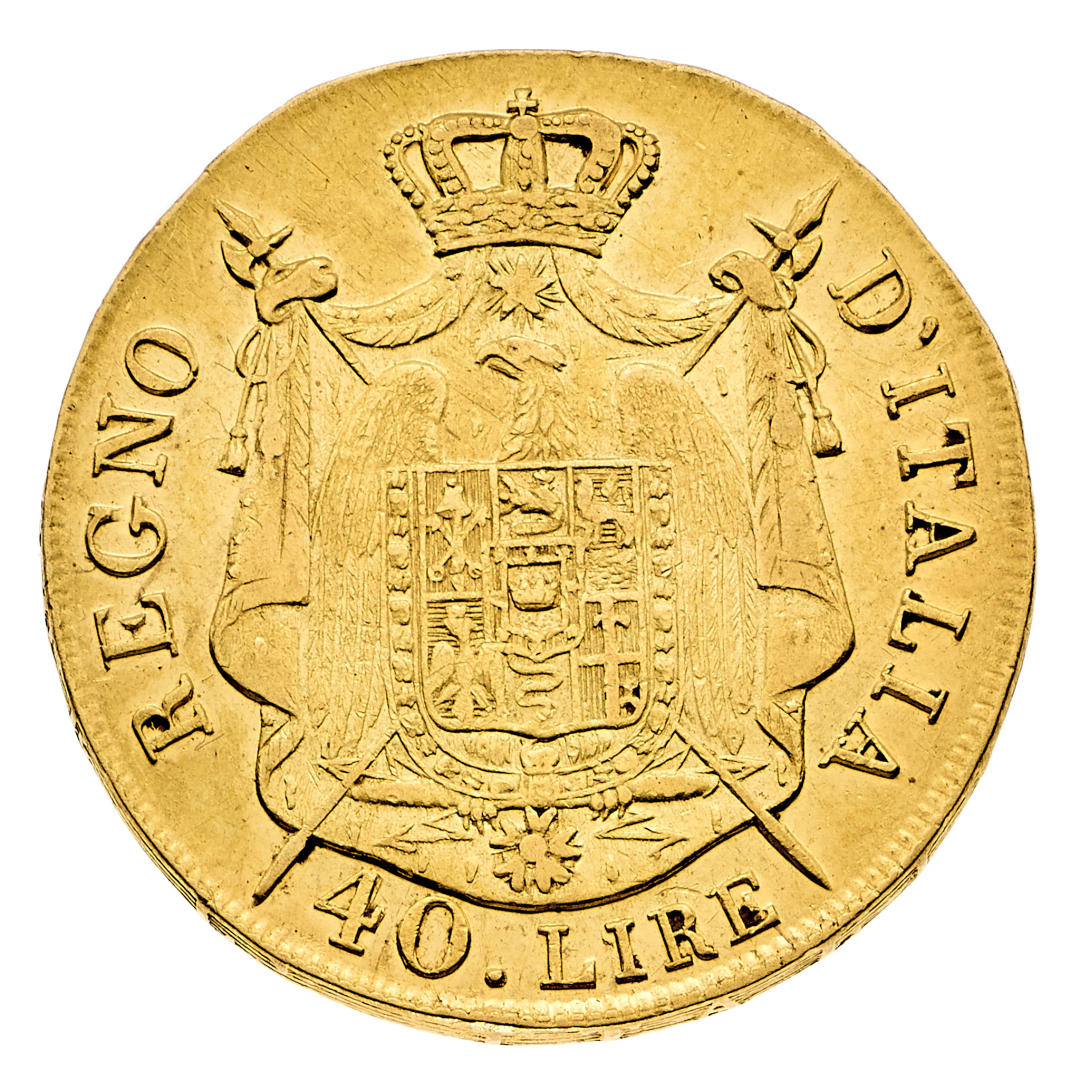 Napoleone I Re d'Italia (1805-1814) - 40 Lire 1808 - Zecca: Milano - Diritto: effigie di Napoleone a sinistra - Rovescio: stemma sovrapposto all'aquila napoleonica entro un padiglione coronato e riccamente ornato - gr. 12,85 - Migliore di BB