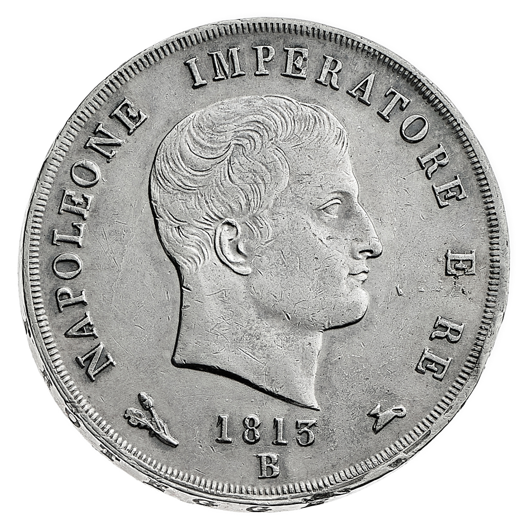 Napoleone I Re d'Italia (1805-1814) - 5 Lire 1813 - Zecca: Bologna - Diritto: effigie di Napoleone a destra - Rovescio: stemma sovrapposto all'aquila napoleonica entro un padiglione coronato e riccamente ornato - gr. 25,00 - Rara - SPL