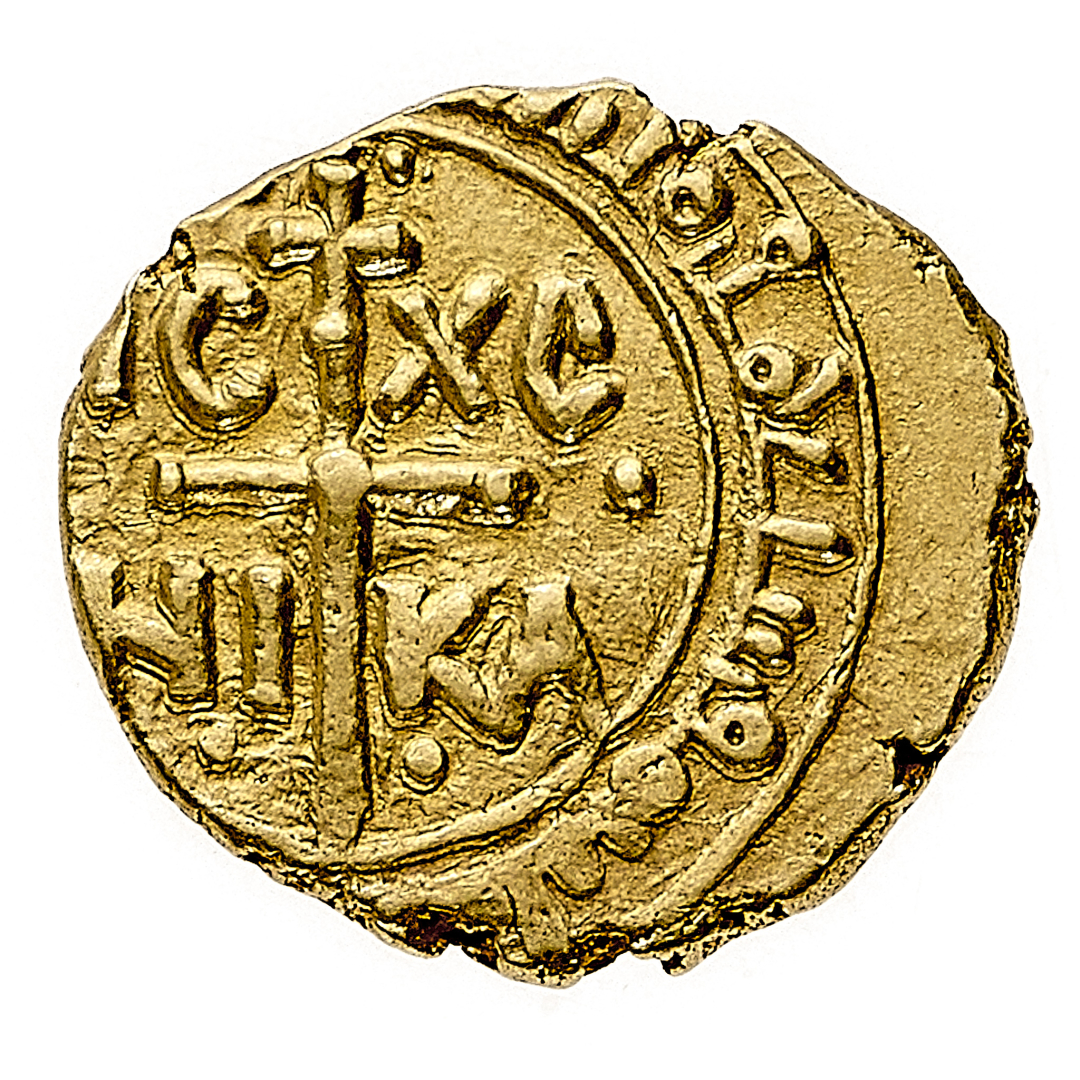 Tancredi (1190-1194) - Tarì - Zecca: Palermo o Messina - Diritto: globetto al centro, intorno al quale si sviluppano due livelli di legenda circolare concentrica - Rovescio: croce innestata su un'asta e accostata da due coppie di sigle sovrapposte - gr. 1,80 - Rara - Lievi debolezze di conio, comunque SPL