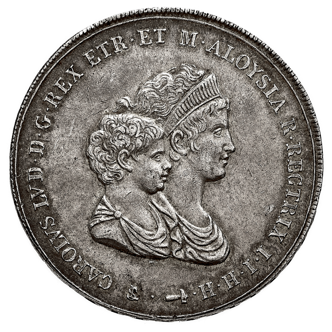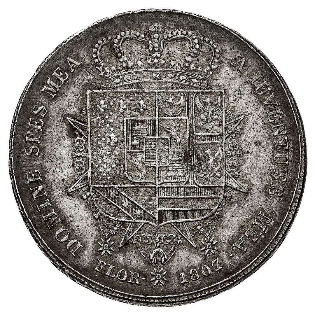 Carlo Ludovico di Borbone (1803-1807) - Dena (10 Lire) 1807 - Zecca: Firenze - Diritto: busti accollati del Re e della madre reggente, Maria Luigia di Spagna, a destra - Rovescio: stemma coronato sovrapposto alla croce di Santo Stefano e circondato dal Collare del Toson d'Oro - gr. 39,28 - Patina di medagliere, SPL