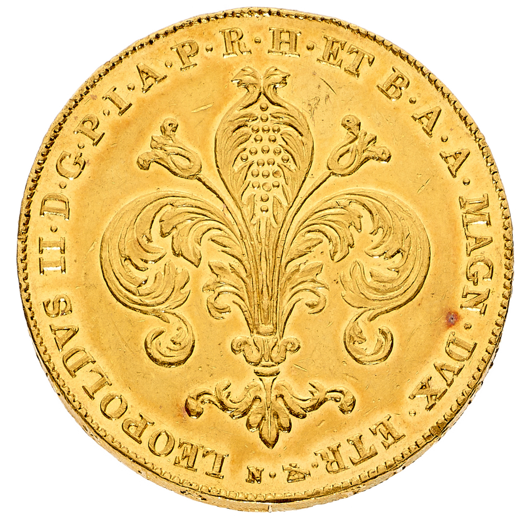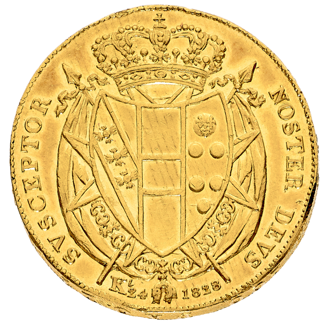 Leopoldo II di Lorena (1824-1859) - 80 Fiorini 1828 - Zecca: Firenze - Diritto: giglio fiorentino - Rovescio: stemma coronato su croce di Santo Stefano, ornato dal Collare del Toson d'Oro - gr. 32,60 - Non comune - Lievi colpetti al contorno, ma con fondi lucenti, migliore di SPL