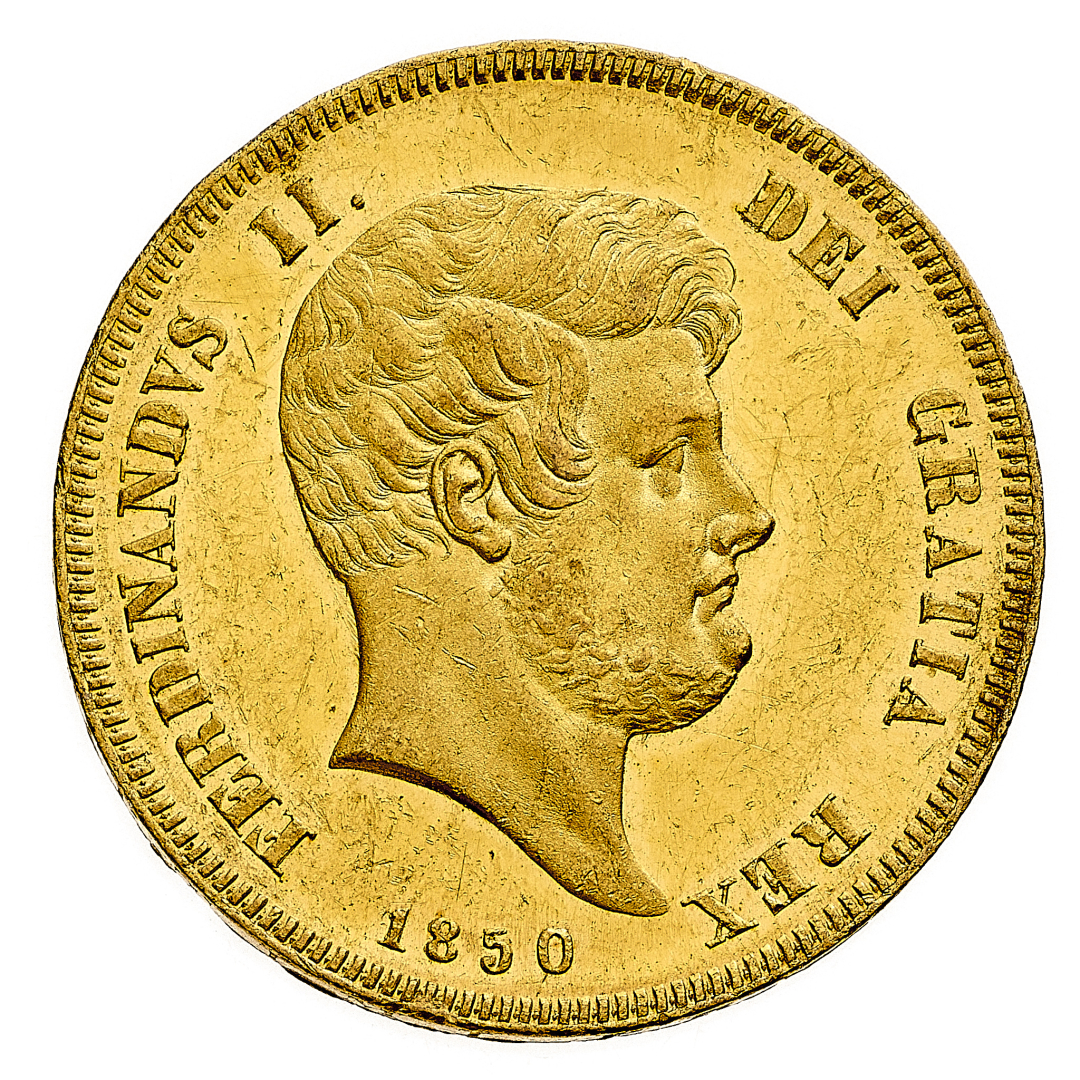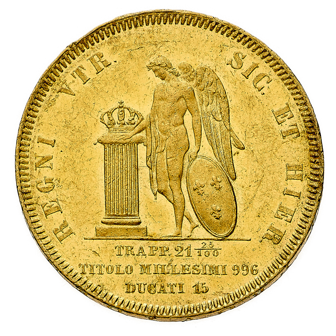Ferdinando II di Borbone (1830-1859) - 15 Ducati 1850 - Zecca: Napoli - Diritto: effigie del Re a destra - Rovescio: il Genio alato stante a sinistra poggia la mano destra su un troncone di colona coronato e tiene con la sinistra uno scudo ovale con i gigli di Borbone - gr. 18,91 - Rara - Lieve colpetto sul contorno, altrimenti migliore di SPL