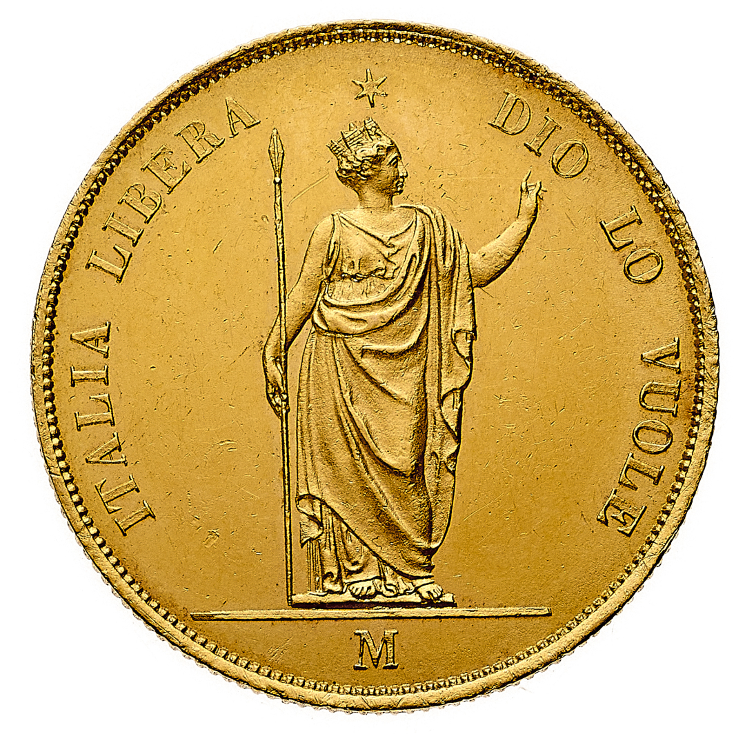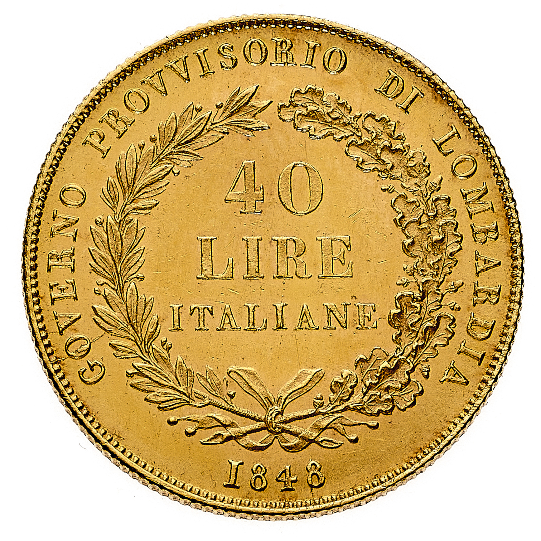 Lombardia - 40 Lire 1848 - Zecca: Milano - Diritto: valore entro corona di alloro e di quercia - Rovescio: Italia turrita stante con asta - gr. 12,91 - Fondi lucenti, migliore di SPL