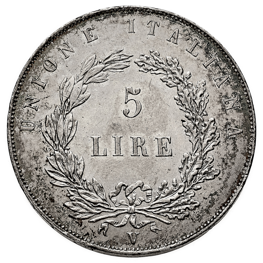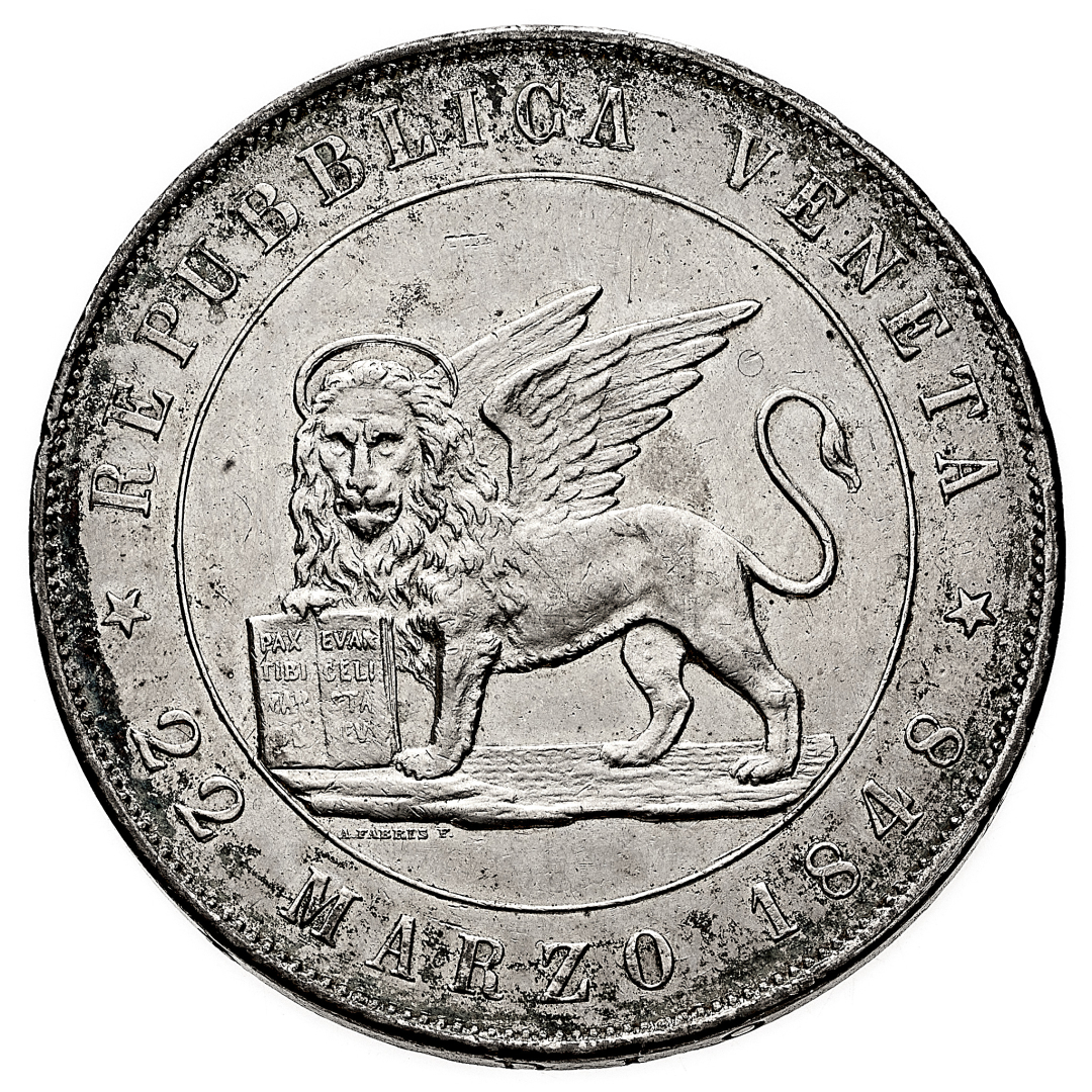 Venezia - 5 Lire 1848 - Zecca: Venezia - Diritto: leone di San Marco a sinistra con la testa di fronte, regge il Vangelo con la zampa anteriore destra - Rovescio: valore entro corona di alloro e quercia - gr. 24,97 - Migliore di SPL
