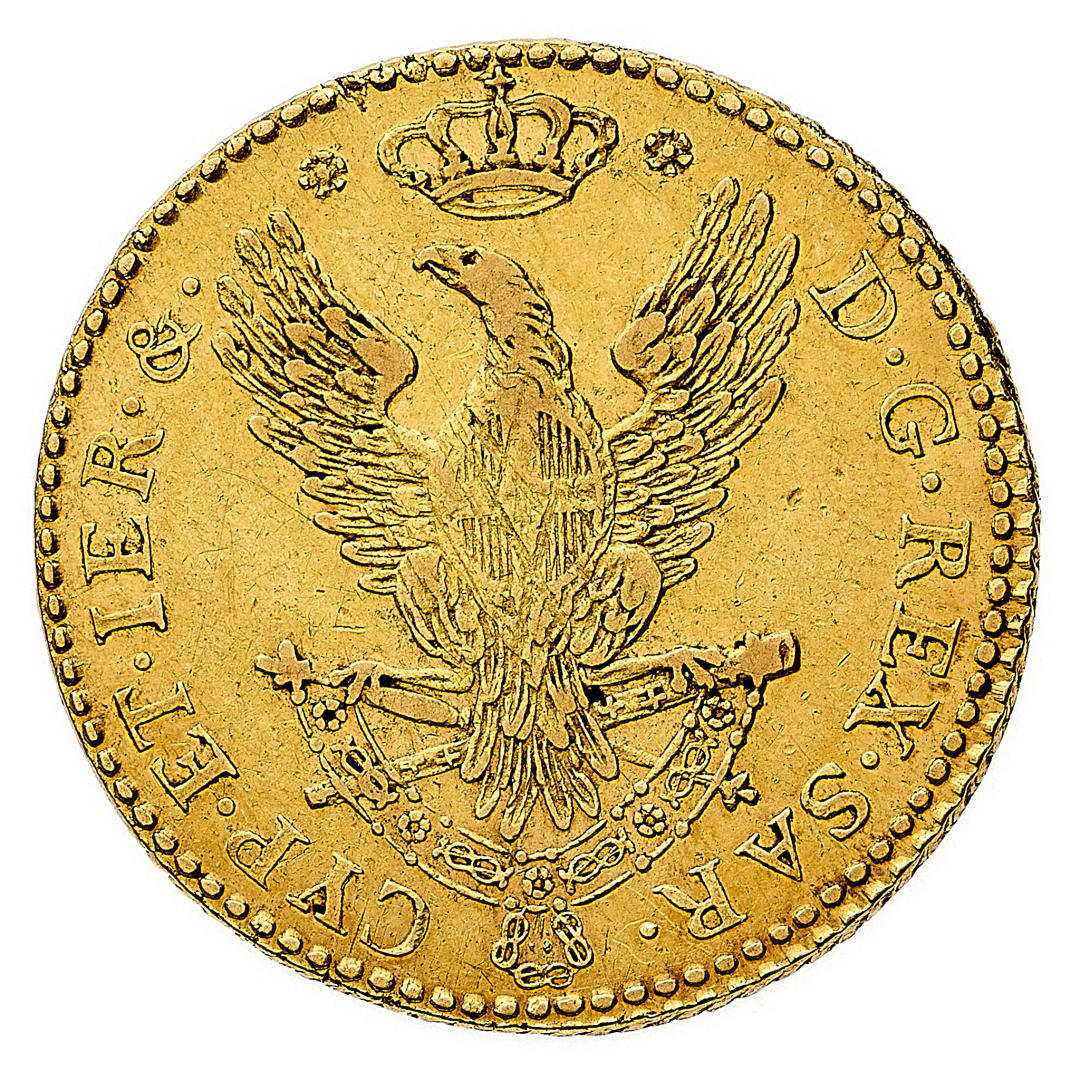 Doppia 1798 - Zecca: Torino - Diritto: effigie del Re a sinistra - Rovescio: aquila coronata ad ali spiegate con stemma sabaudo in petto sopra scettro, bastone e Collare dell'Annunziata - gr. 9,09 - Variante con iniziali G L sul collo - Molto rara - BB
