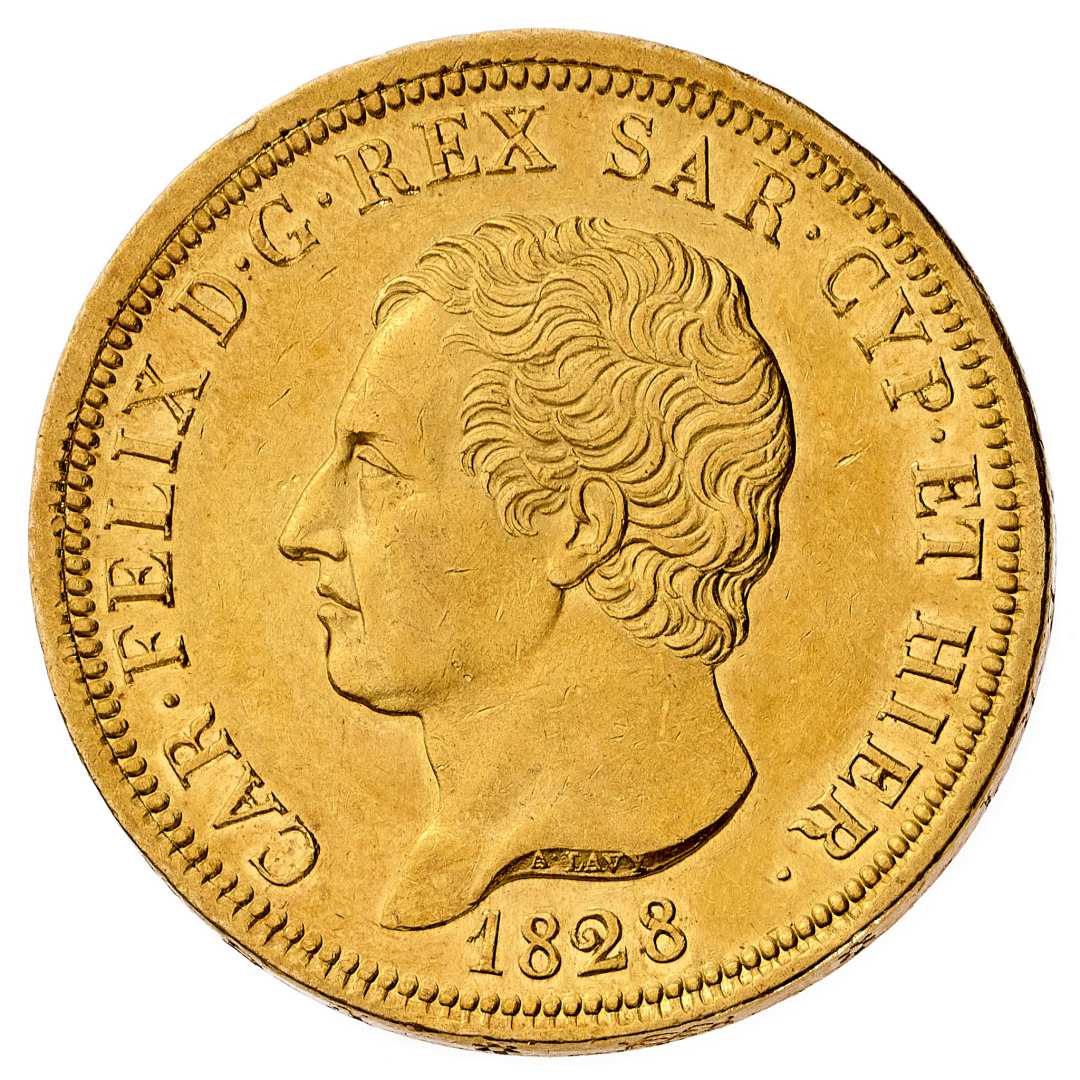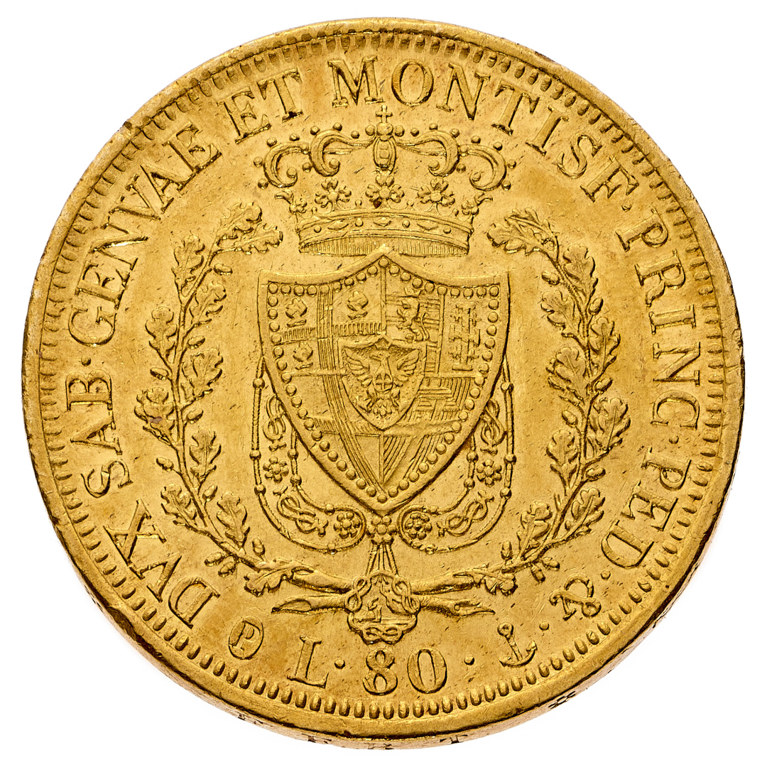 80 Lire 1828 - Zecca: Genova - Diritto: effigie del Re a sinistra - Rovescio: stemma completo di Casa Savoia coronato e circondato dal Collare dell'Annunziata - gr. 25,83 - Migliore di SPL
