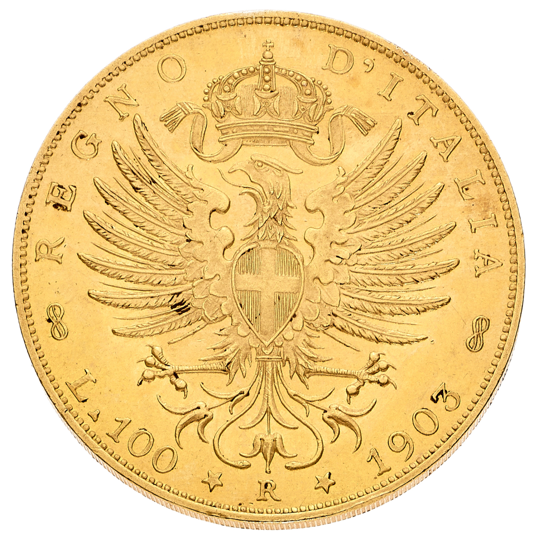 100 Lire Aquila Sabauda 1903 NGC MS 61 - Zecca: Roma - Diritto: effigie del Re a sinistra - Rovescio: aquila coronata ad ali spiegate con stemma sabaudo in petto - gr. 32,24 - Rara - Cert. #8586306-003
