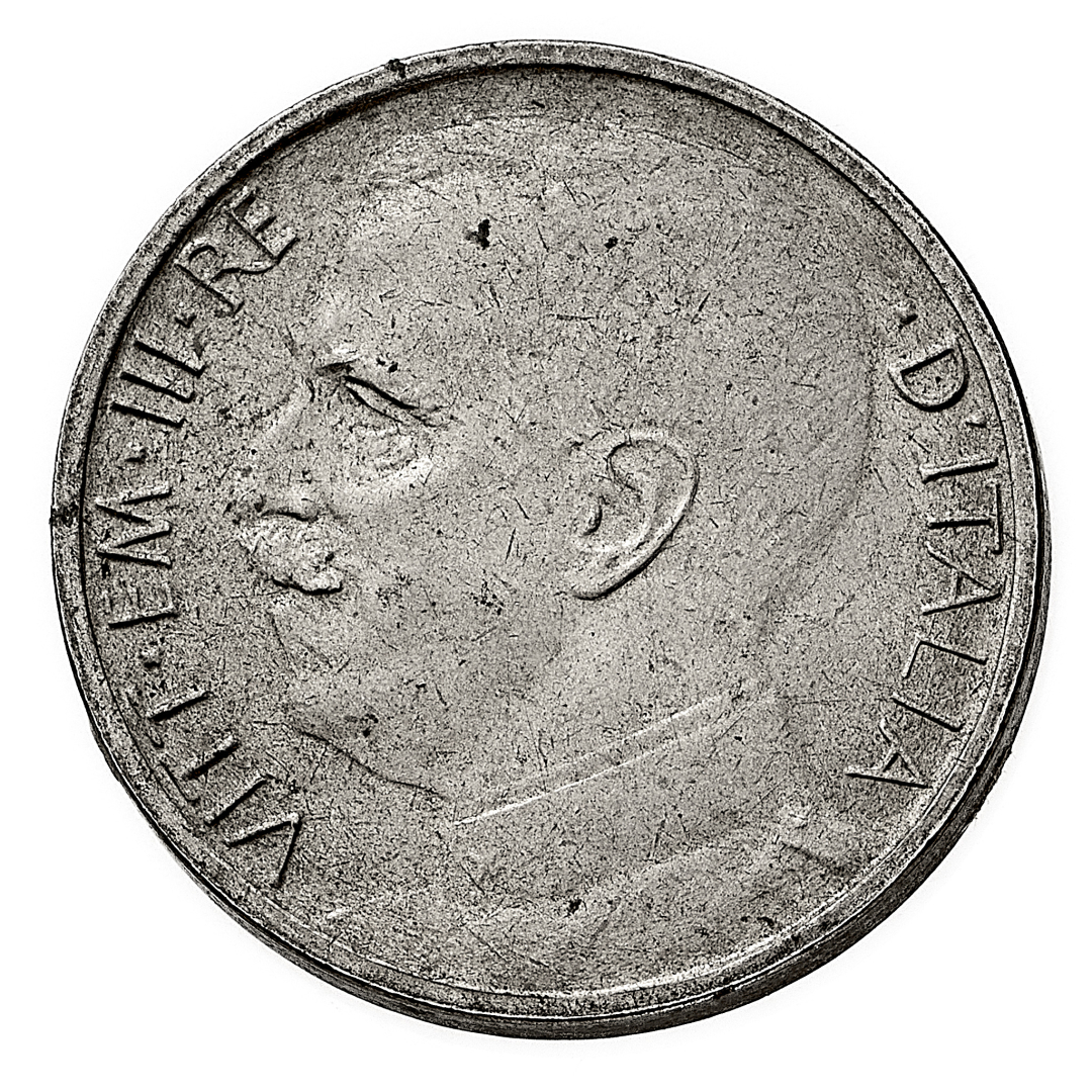 50 Centesimi Leoni 1927 contorno liscio - Zecca: Roma - Diritto: effigie del Re a sinistra - Rovescio: l'Italia seduta su quadriga di leoni al passo verso destra - gr. 5,95 - Rara, solo 100 esemplari coniati - SPL