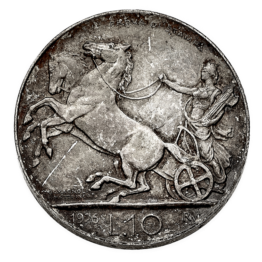 10 Lire Biga 1926 Prova di Stampa - Zecca: Roma - Diritto: effigie del Re a sinistra - Rovescio: allegoria dell'Italia con fascio littorio su biga al galoppo verso sinistra; nel campo, in alto, la dicitura PROVA DI STAMPA - gr. 9,99 - Molto rara - q.FDC