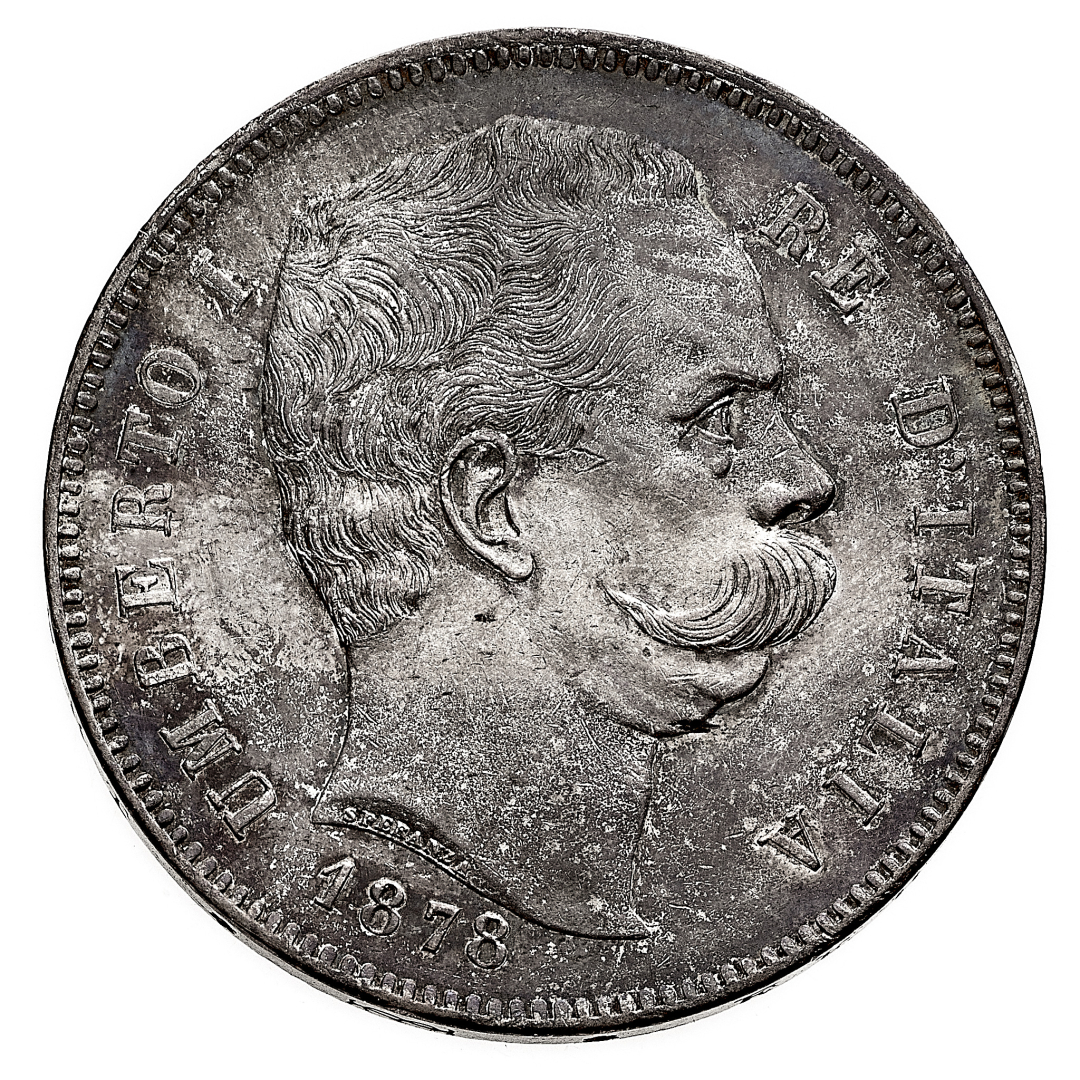 5 Lire 1878 - Zecca: Roma - Diritto: effigie del Re a destra - Rovescio: stemma di Casa Savoia coronato e circondato dal Collare dell'Annunziata - gr. 24,97 - Splendida patina iridescente, SPL