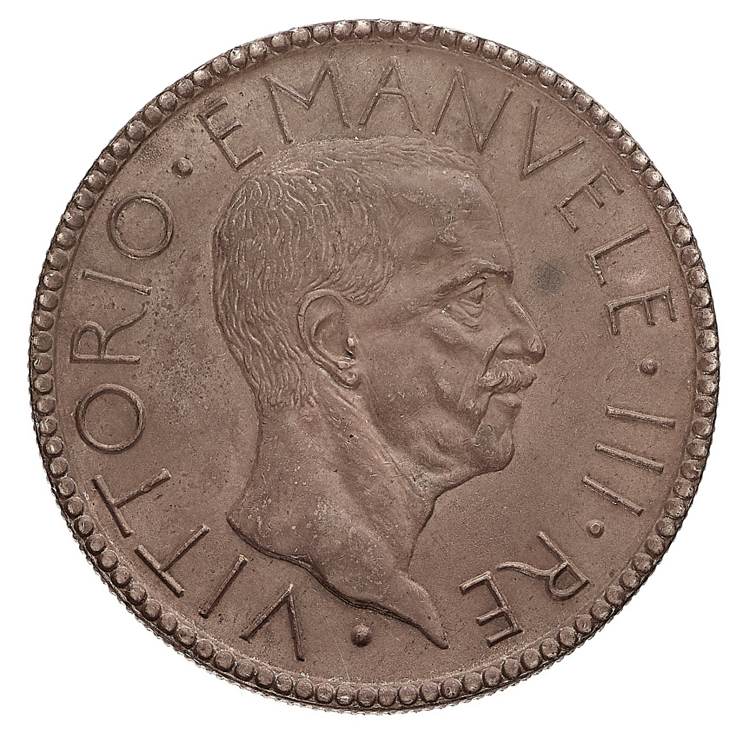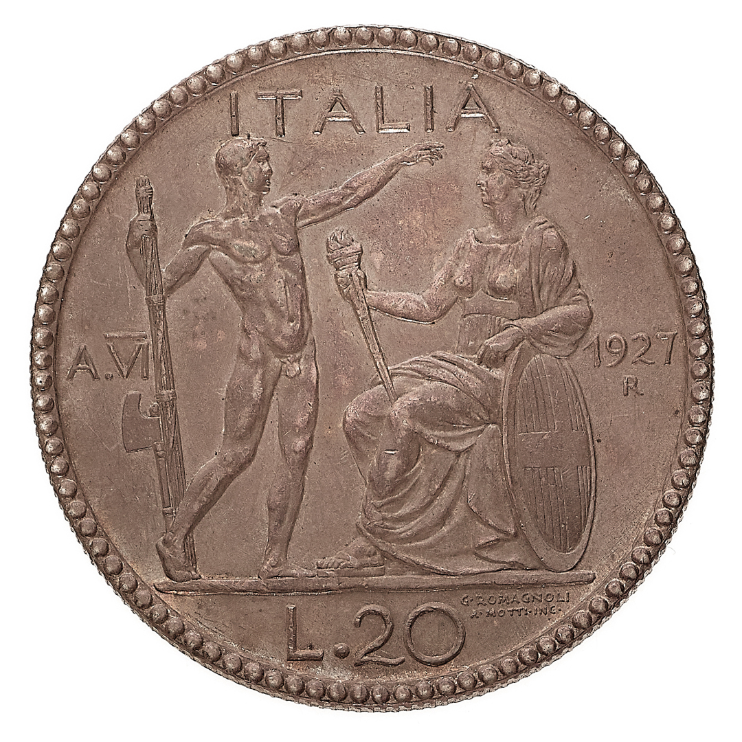 20 Lire Littore 1927 Anno VI - Zecca: Roma - Diritto: effigie del Re a destra - Rovescio: littore con fascio nella mano destra, saluta romanamente l'Italia seduta con fiaccola e scudo sabaudo - gr. 15,00 - Patina di medagliere, migliore di SPL