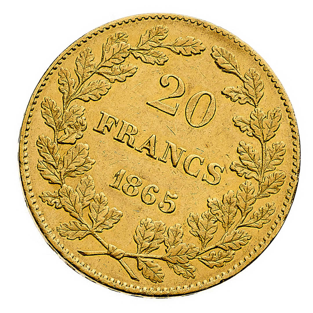 Leopold I (1831-1865) - 20 Franchi 1865 - Zecca: Bruxelles - Diritto: effigie del Re a destra - Rovescio: valore e data entro rami di quercia - gr. 6,44 - SPL