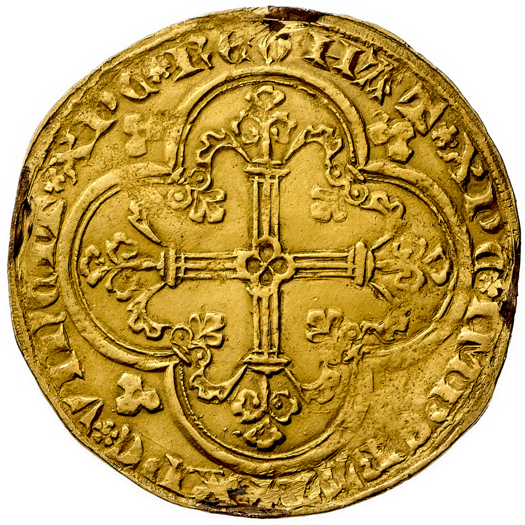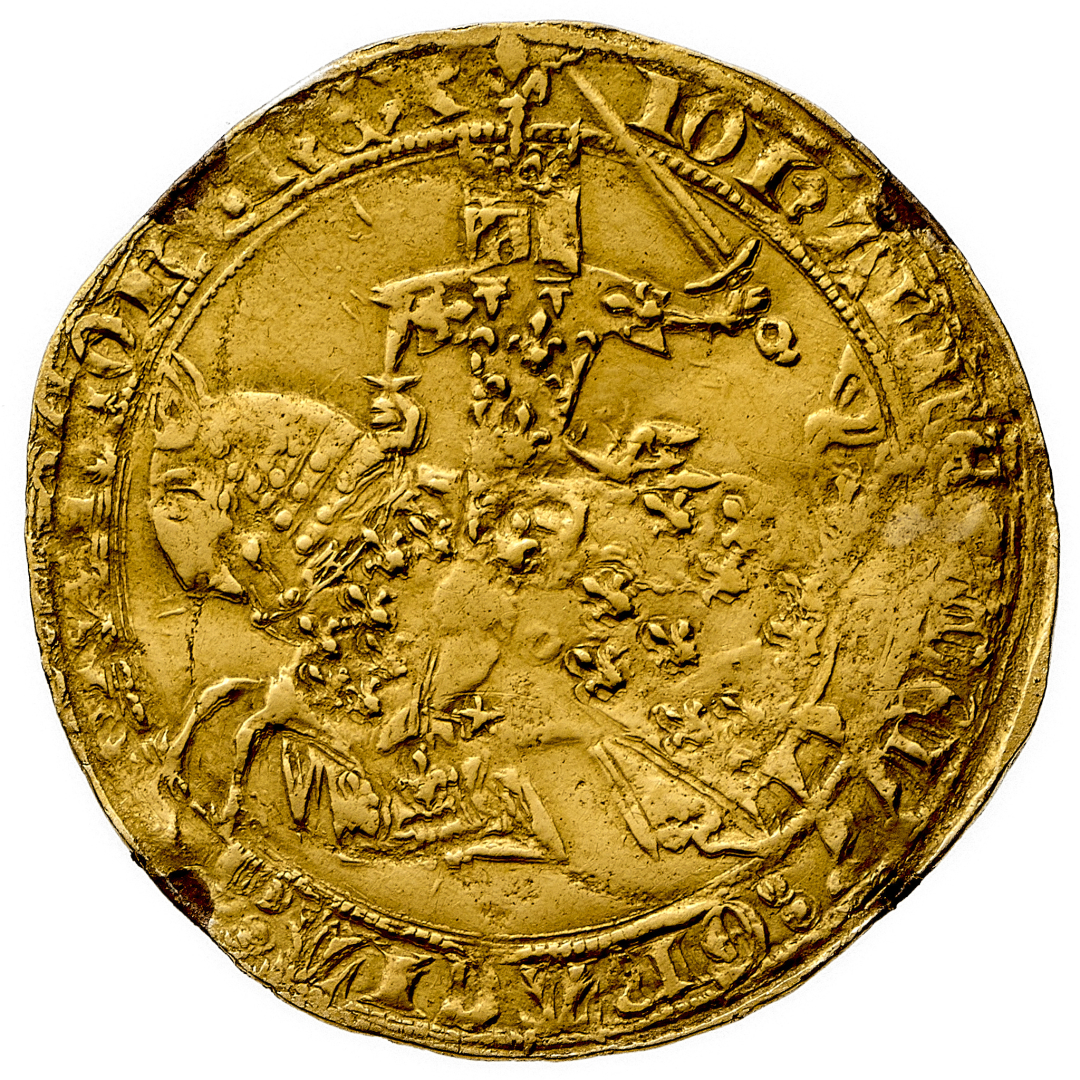 Jean II Le Bon (1350-1364) - Franc "à cheval" - Diritto: il Re su un cavallo al galoppo verso sinistra regge una spada con la mano destra - Rovescio: croce fiorata entro una doppia cornice quadrilobata - gr. 3,84 - Tracce di montatura, BB