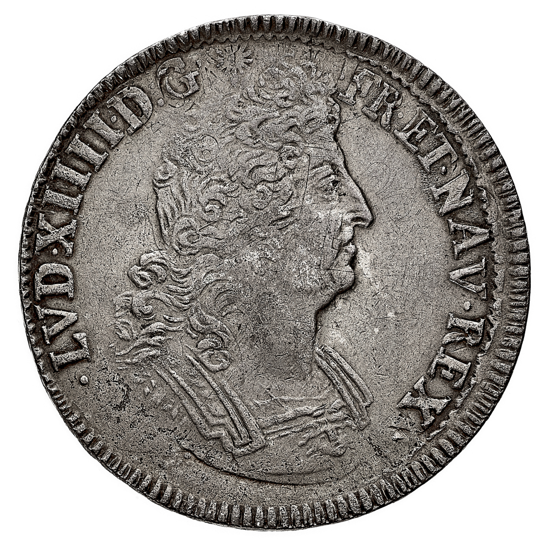 Louis XIV (1643-1715) - Ecu "aux insignes" 1702 (?) - Zecca: Troyes - Diritto: busto del Re a destra - Rovescio: tre gigli racchiusi in una cornice coronata - gr. 27,05 - Ribattuta, SPL con patina di antica collezione