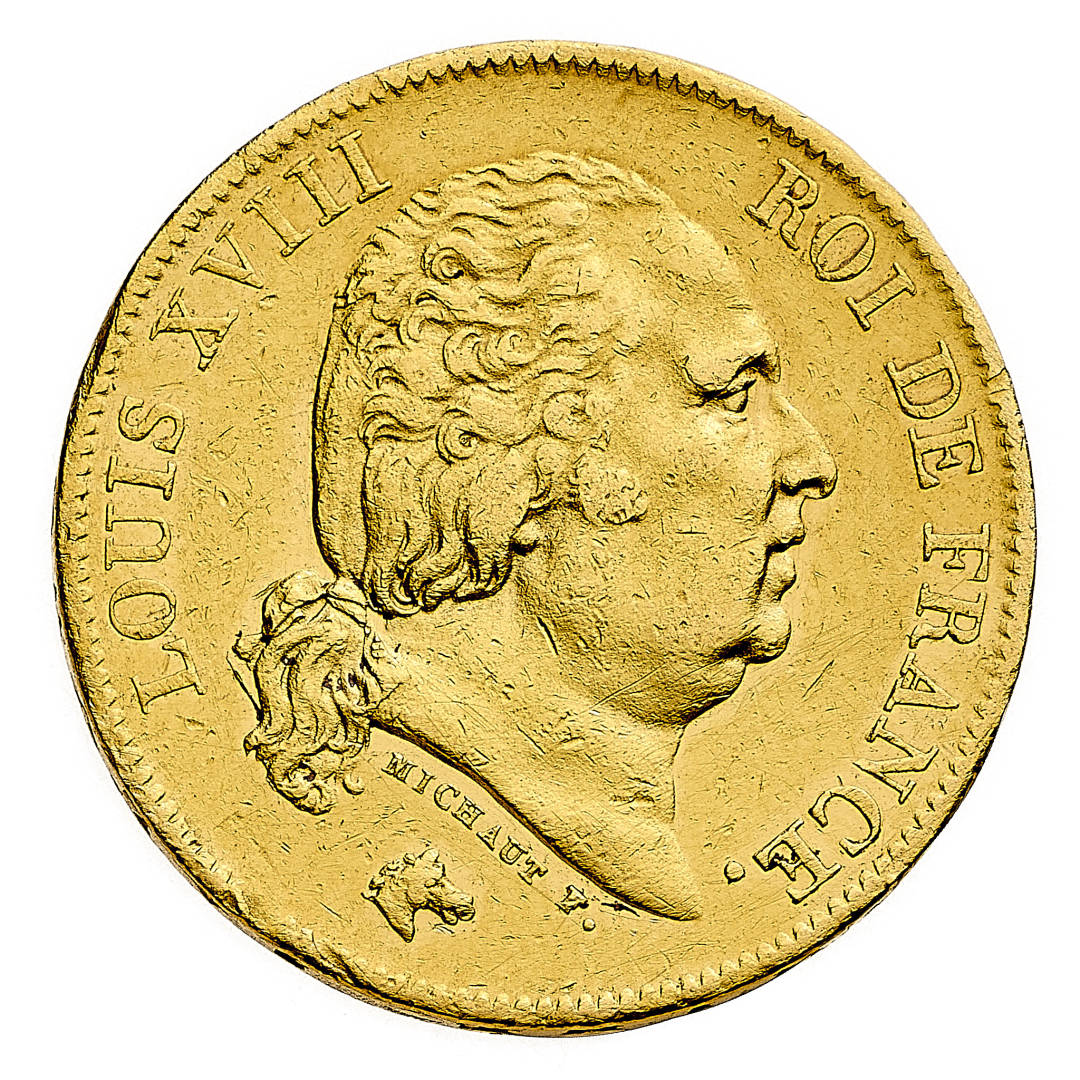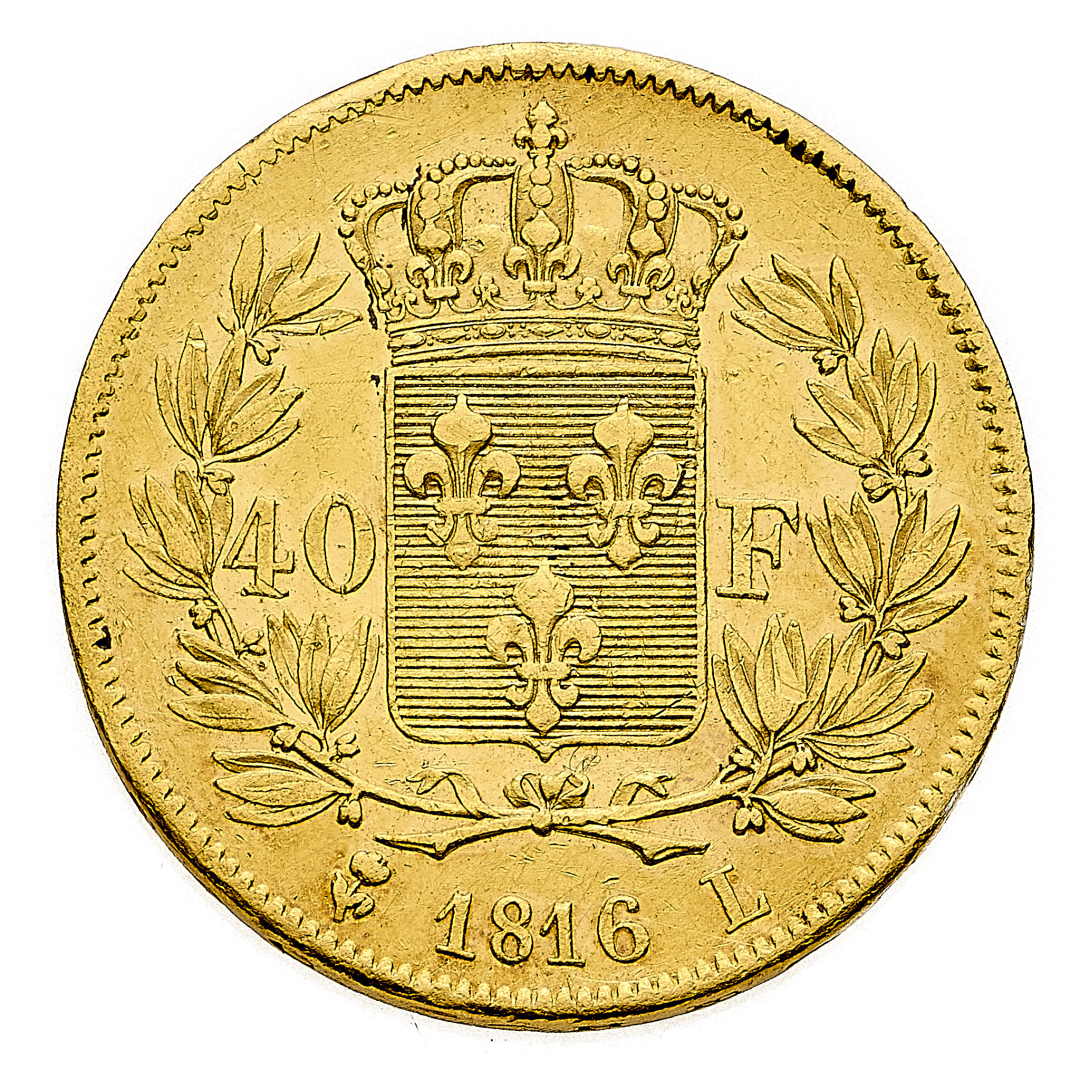 Louis XVIII (1814-1824) - 40 Franchi 1816 - Zecca: Bayonne - Diritto: effigie del Re a destra - Rovescio: stemma coronato entro due rami di alloro - gr. 12,87 - Rara - q.SPL