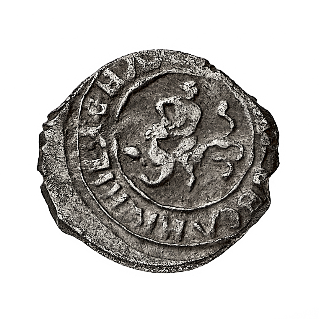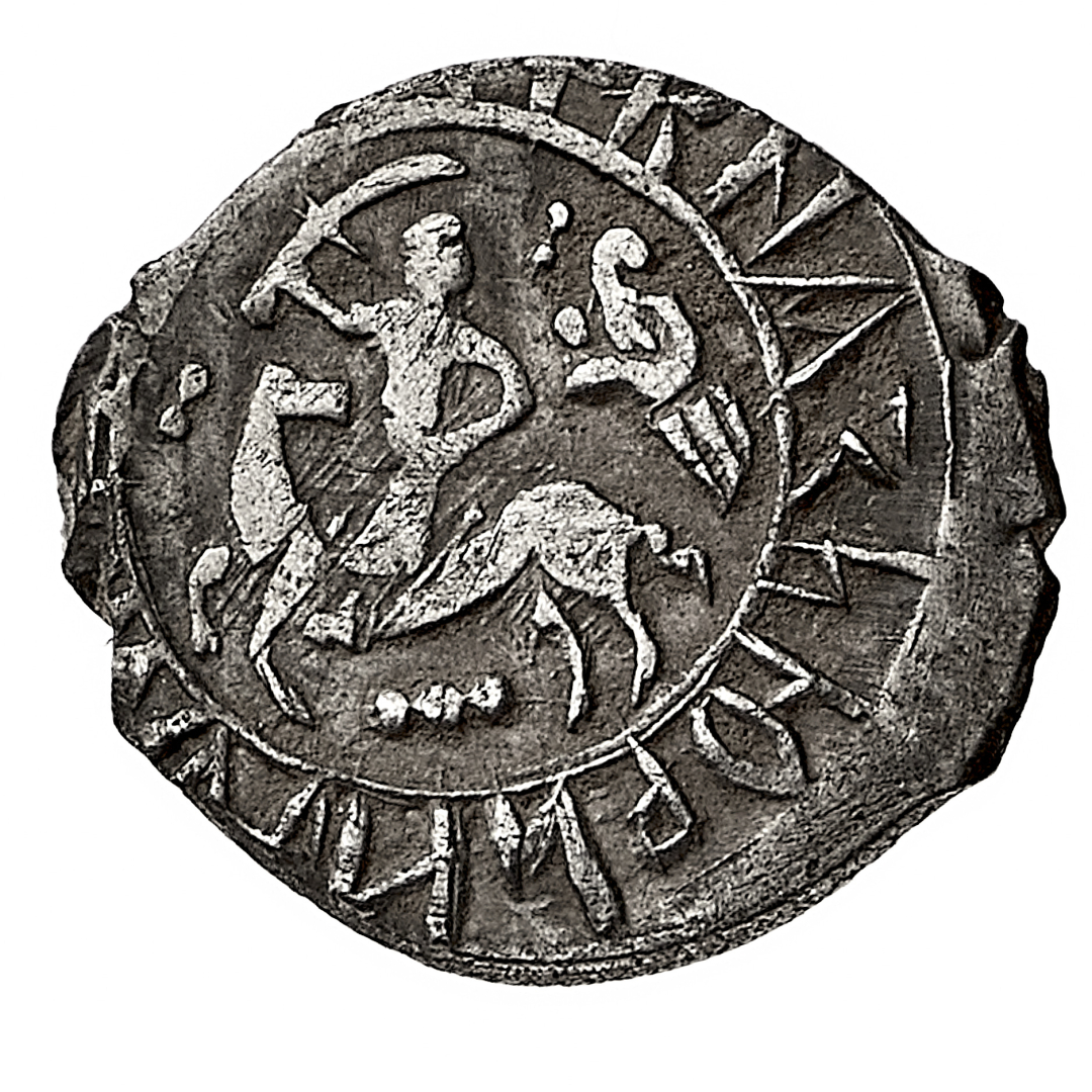 Vasiliy Dmitrievich e Yury Dmitrievich (1423-1425) - Denga - Diritto: cavaliere al galoppo verso sinistra - Rovescio: Sansone che lotta con un leone - gr. 0,68 - Molto rara - BB - Proveniente dall'asta Katz eAuction 70, 13.12.2022, n. 1104