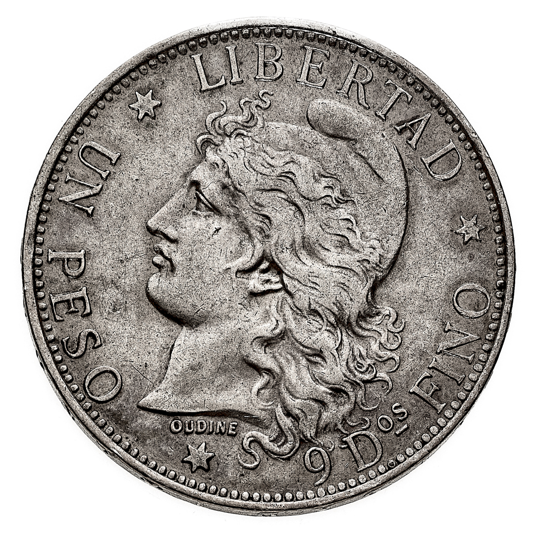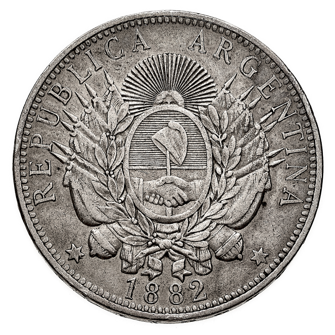 Repubblica (dal 1816) - Peso 1882 - Zecca: Buenos Aires - Diritto: effigie di donna a sinistra rappresentate la Libertà - Rovescio: stemma dell'Argentina circondato da bandiere - gr. 24,90 - Lievi colpetti al contorno, migliore di BB