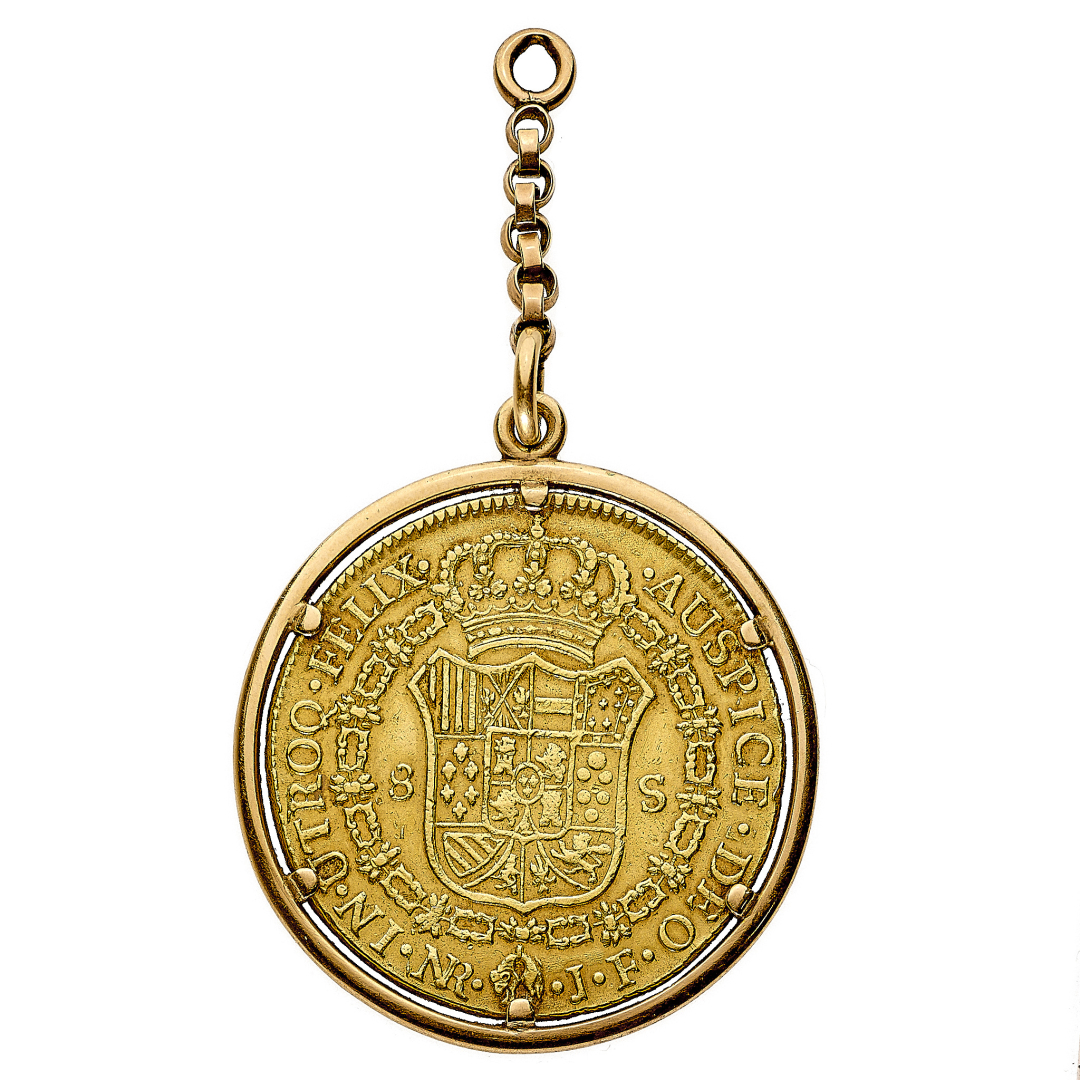 Ferdinando VII (1808-1833) - 8 Escudos 1815 NR-JF - Zecca: Santa Fe de Nuevo Reino - Diritto: effigie del Re a destra - Rovescio: stemma coronato e circondato dal Collare del Toson d'Oro - gr. 33,55 - Momntata in un elegante ciondolo, BB