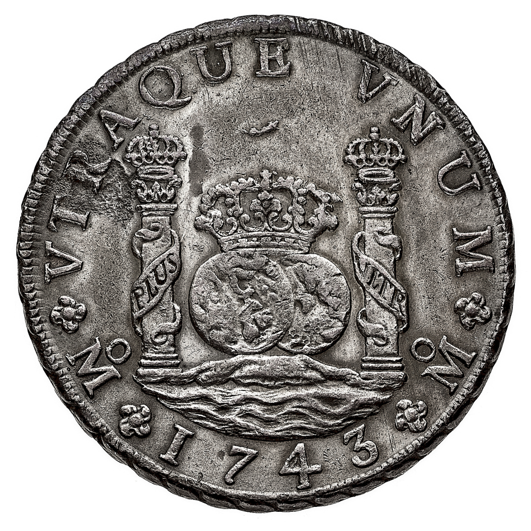 Filippo V (1700-1746) - 8 Reales 1743 - Zecca: Città del Messico - Diritto: stemma coronato - Rovescio: due emisferi affiancati e sovrastati dalla corona fra le colonne d'Ercole - gr. 26,84 - Lievi difetti del metallo, q.SPL