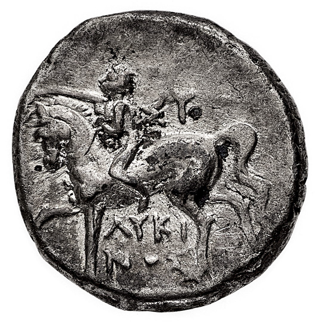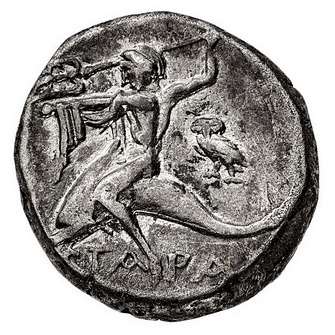 Taranto - Didramma databile al periodo 272-235 a.C. - Diritto: giovane cavaliere incorona il cavallo al passo verso sinistra - Rovescio: Taras, in groppa al delfino verso sinistra, tiene un tridente con la mano destra e la sinistra protesa in avanti; nel campo, a destra, una civetta - gr. 6,28 - q.SPL