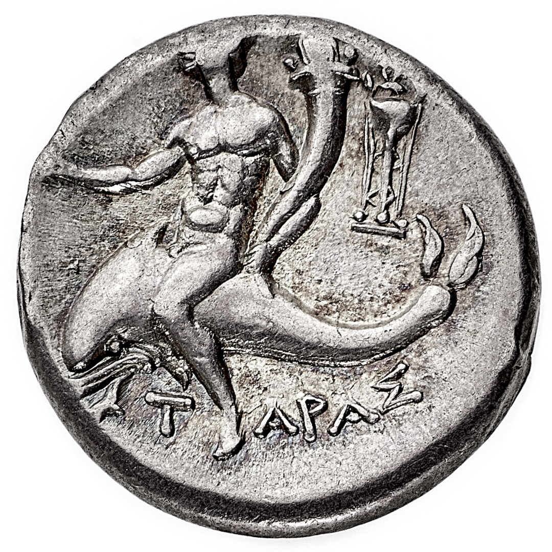 Taranto - Didramma databile al periodo 235-228 a.C. - Diritto: guerriero al galoppo verso destra, rivolge in basso un giavellotto che brandisce con la mano destra; nel campo a sinistra una ghirlanda - Rovescio: Taras, in groppa al delfino verso sinistra, tiene un kantharos con la mano destra e una cornucopia con la sinistra; nel campo a destra un tripode - gr. 6,50 - SPL