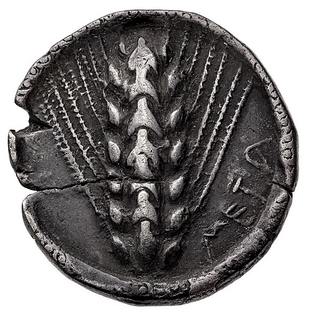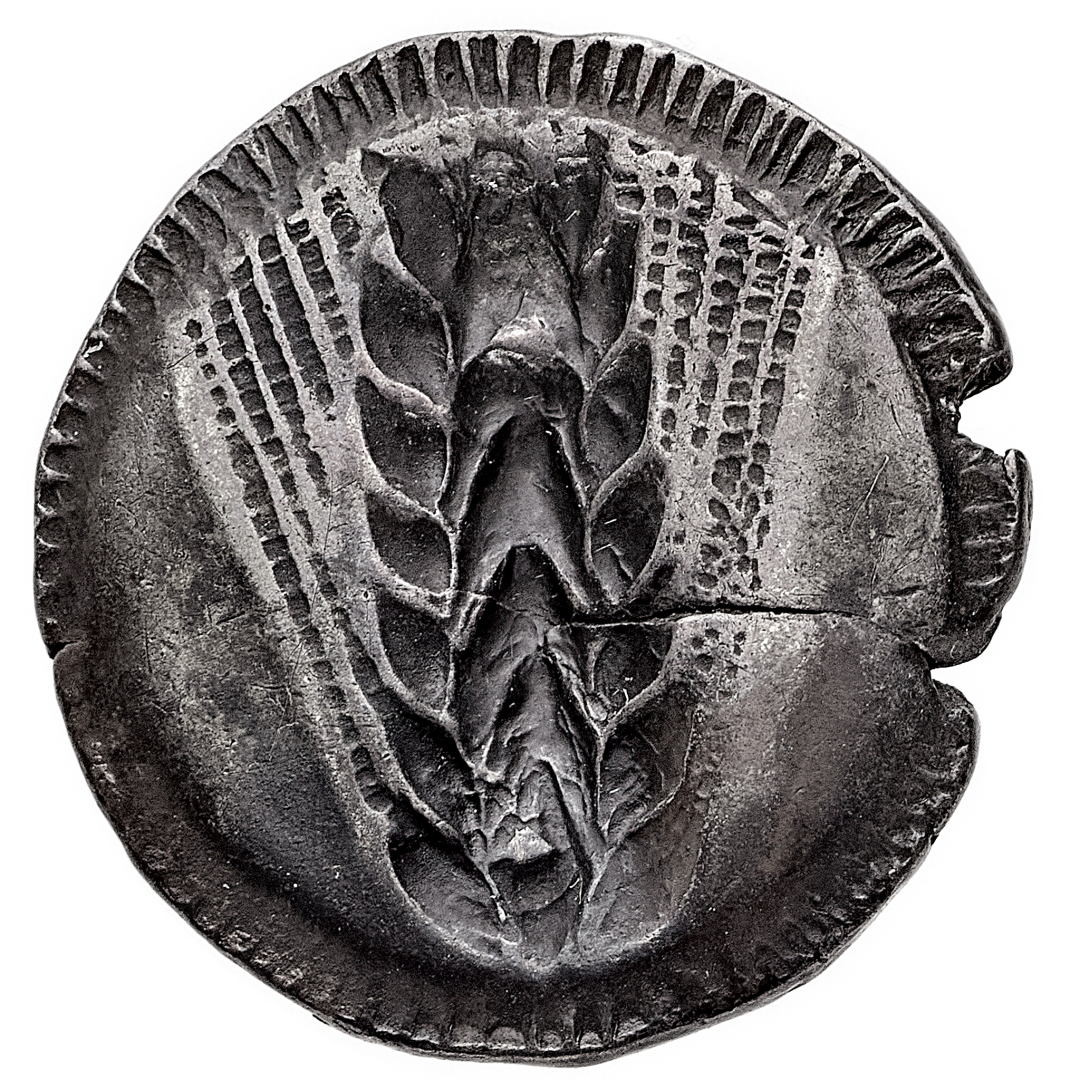 Metaponto - Statere databile al periodo 540-510 a.C. - Diritto: spiga di grano disposta verticalmente - Rovescio: spiga di grano disposta verticalmente in incuso - gr. 7,98 - Rara - Frattura di conio, BB