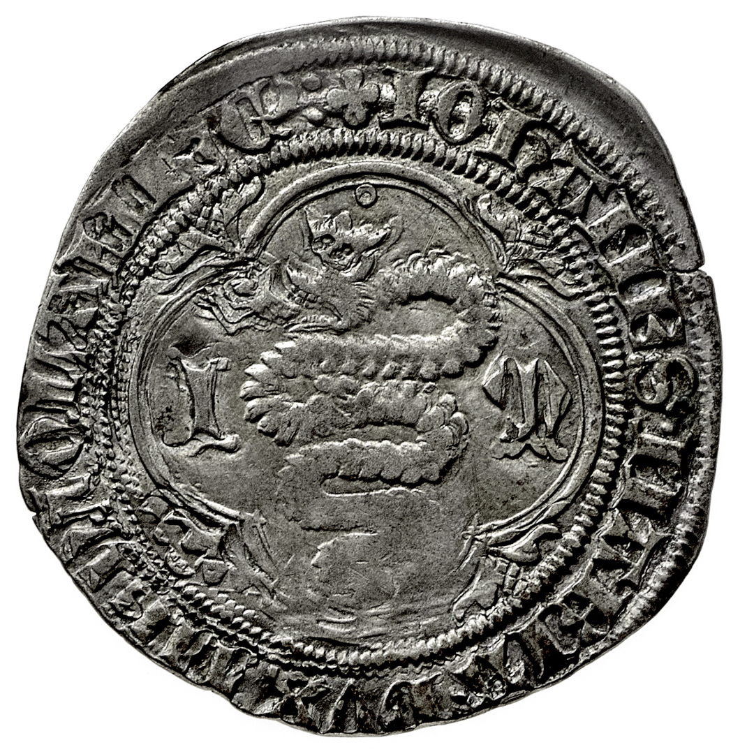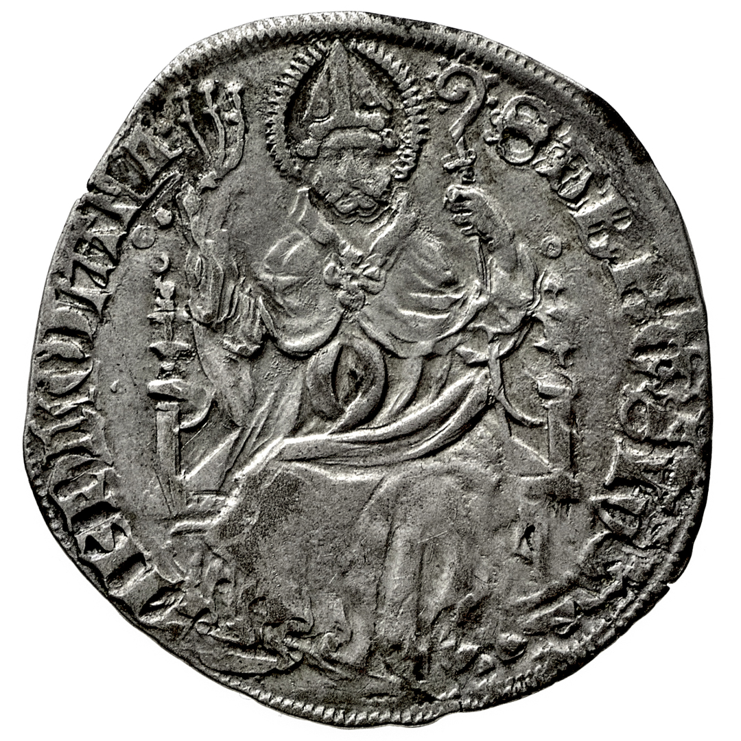 Giovanni Maria Visconti (1402-1412) - Grosso o Pegione - Diritto: Sant'Ambrogio seduto di fronte tiene uno staffile con la mano destra e il pastorale con la sinistra - Rovescio: il biscione visconteo con il fanciullo tra le fauci - gr. 2,40 - SPL