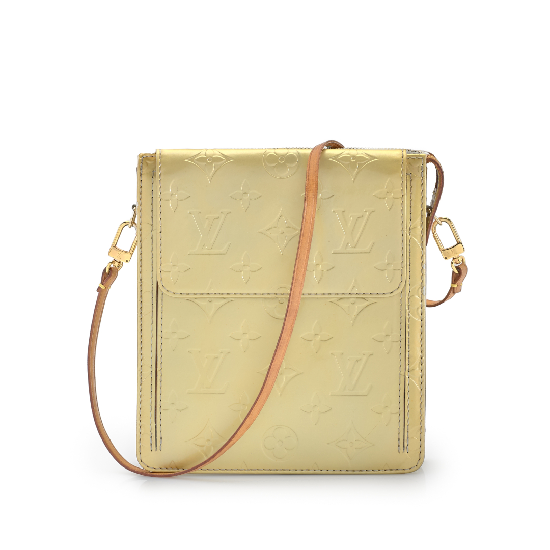 in vernice Monogram oro, interno in pelle grigia. Tracolla amovibile e dettagli in vacchetta. Chiusura con zip con tiretto logato. Una tasca frontale chiusa da poussoir. Hardware in metallo dorato.
