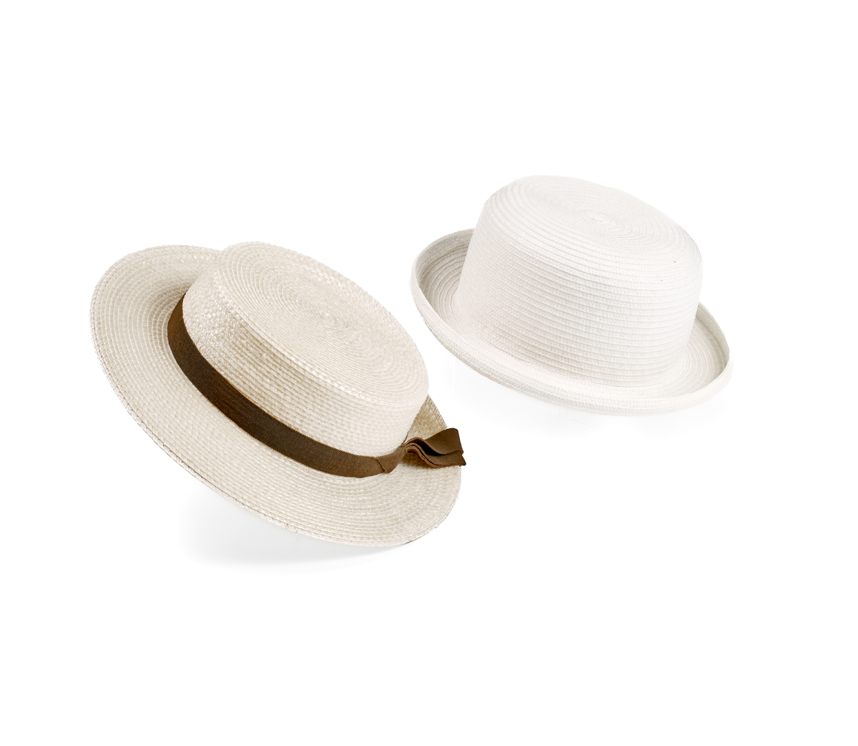 in paglia di ramiè crema con nastro gros grain marrone e bombetta in paglia bianca.