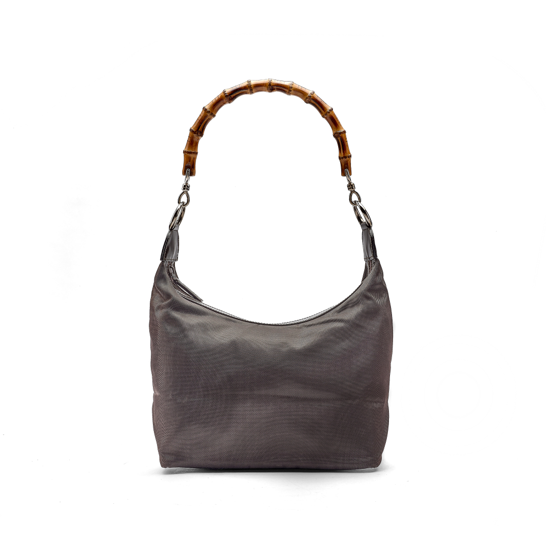 in tessuto tecnico marrone e dettagli in pelle in tinta. Interno in tessuto marrone lavorazione diamante. Manico in bamboo. Chiusura con cerniera fermata da tiretto logato. Hardware in metallo argentato.