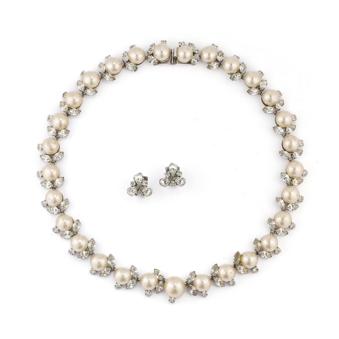 in metallo argentato, perle di vetro e cristalli Swarovski trasparenti, composta da collana e paio di orecchini a clip. Risale al periodo in cui Dior produceva i suoi gioielli in Germania ed erano realizzati a mano da Henkel e Grosse.