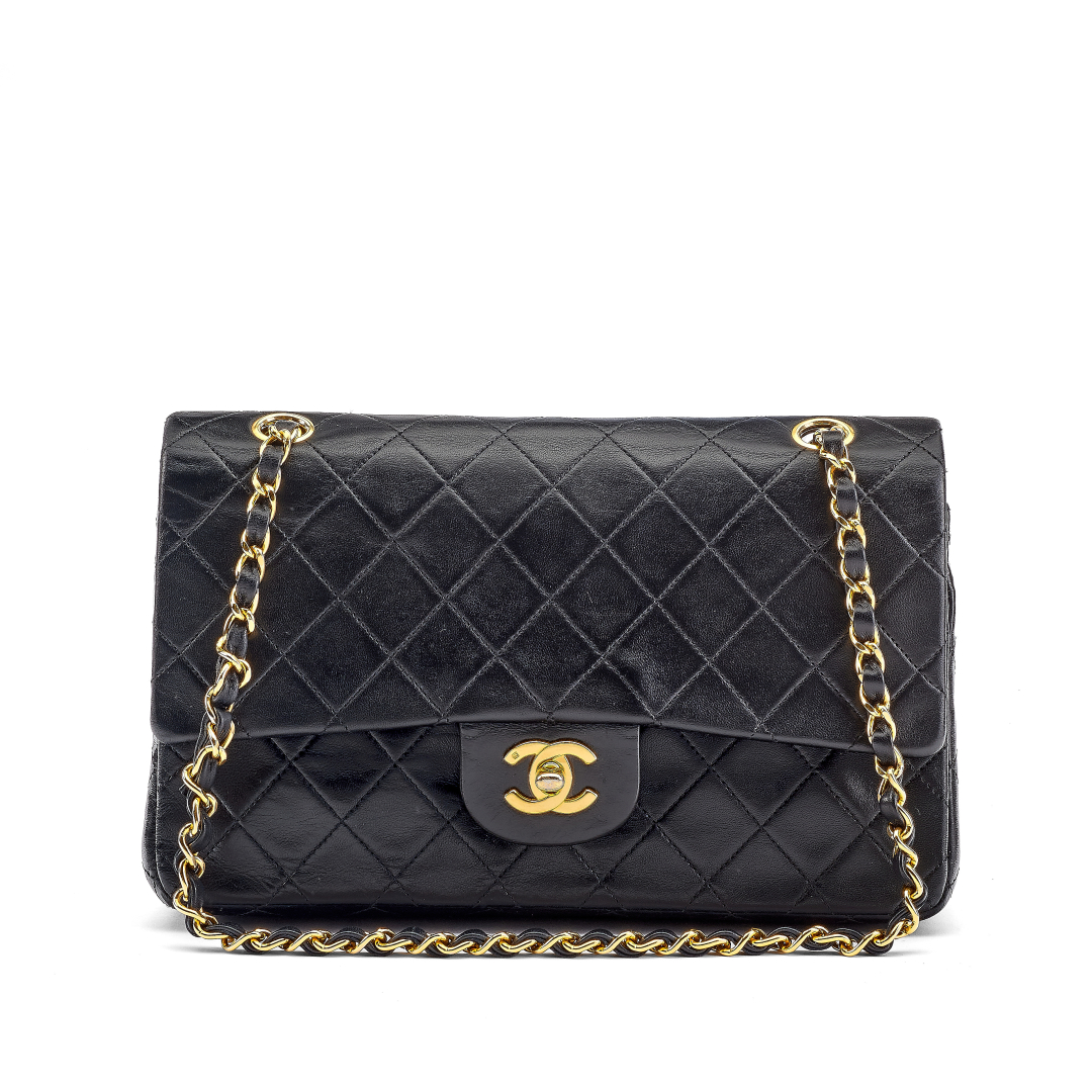 in pelle di agnello nero con lavorazione matelassé. Interno in pelle bordeaux. Doppia catena dorata con intreccio di pelle in tinta. Chiusura con patta fermata da CC a girello. Certificato Chanel di pulitura. Hardware in metallo dorato 24k.