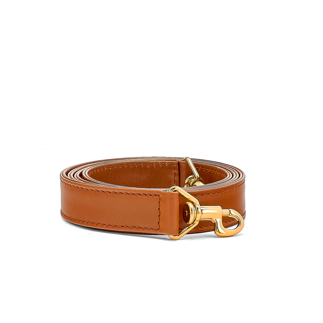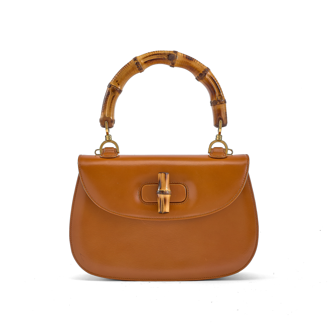 in pelle caramello, interno in pelle beige. Manico e chiusura a torsione in bamboo. Tracolla amovibile in pelle. Hardware in metallo dorato.
