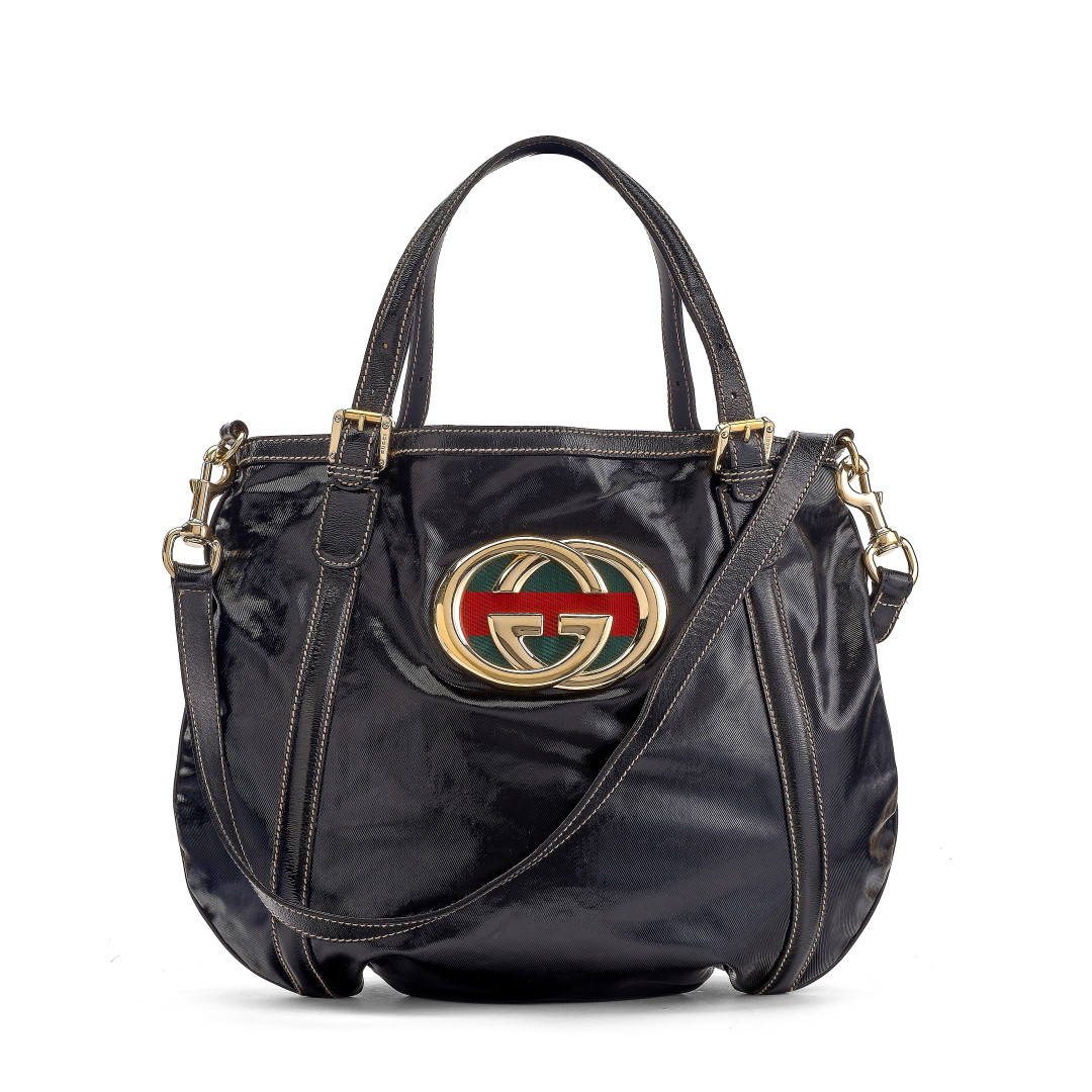 in tela Dialux nera, interno in tessuto tecnico nero. Doppio manico regolabile, tracolla amovibile e dettagli in pelle nera. Chiusura con magnete. Grosso logo con riga Web frontale. Hardware in metallo dorato.