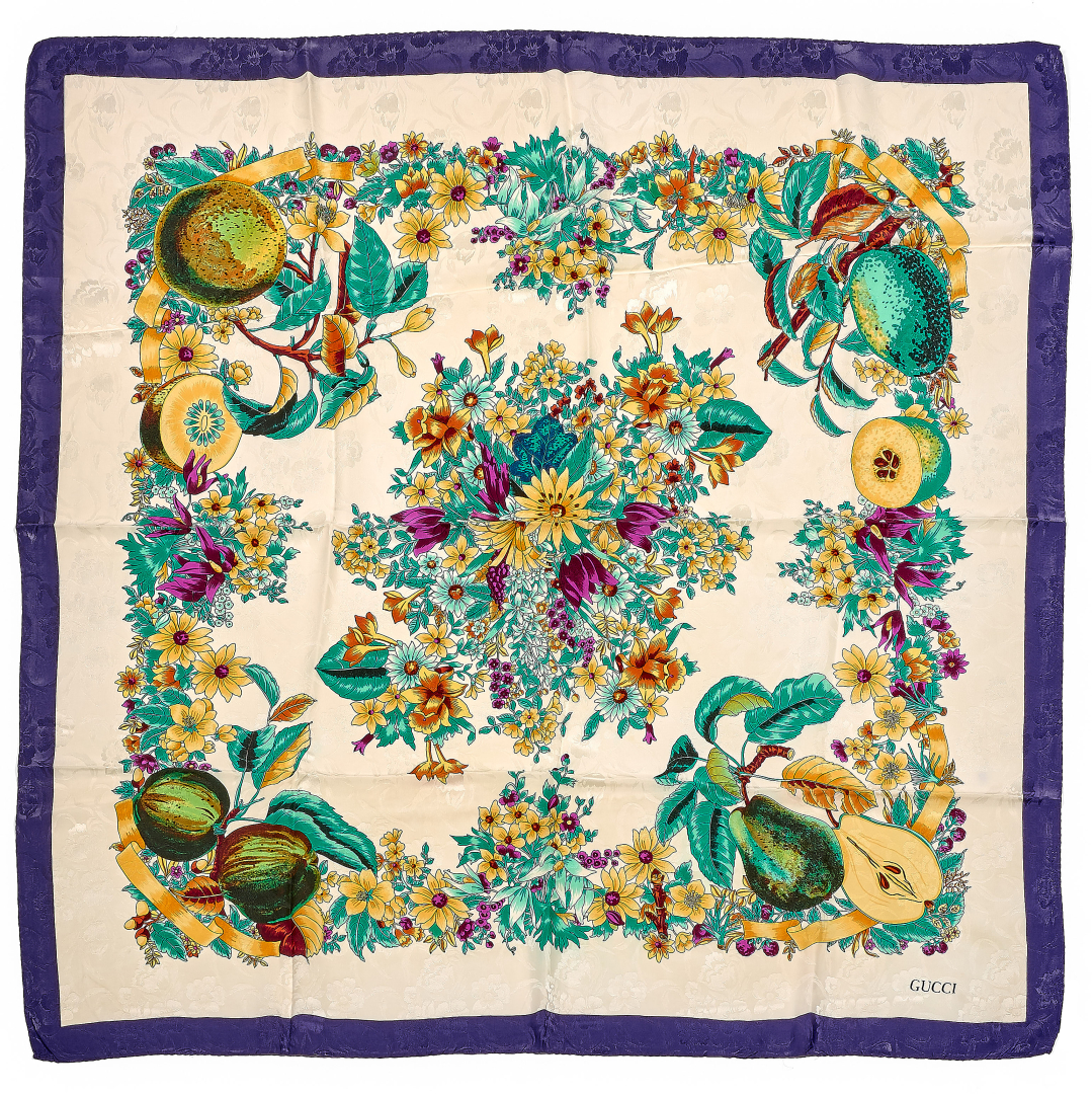 in seta, con stampa di fiori e frutti autunnali su fondo crema.