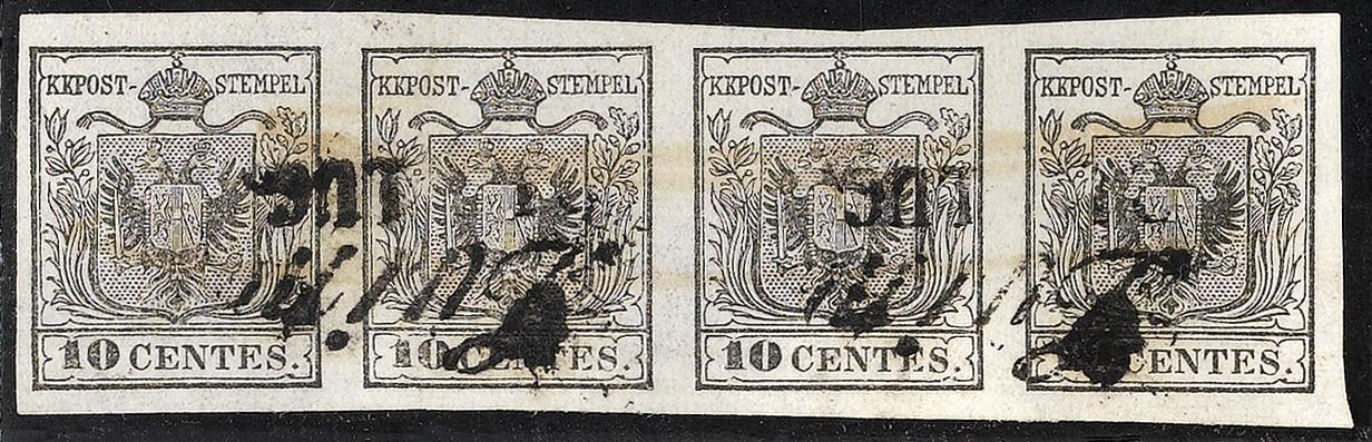 1850 - 10 c. grigio argento I tiratura striscia orizzontale di quattro annullata a Luino, ex collezione Capellaro - Cert. Diena