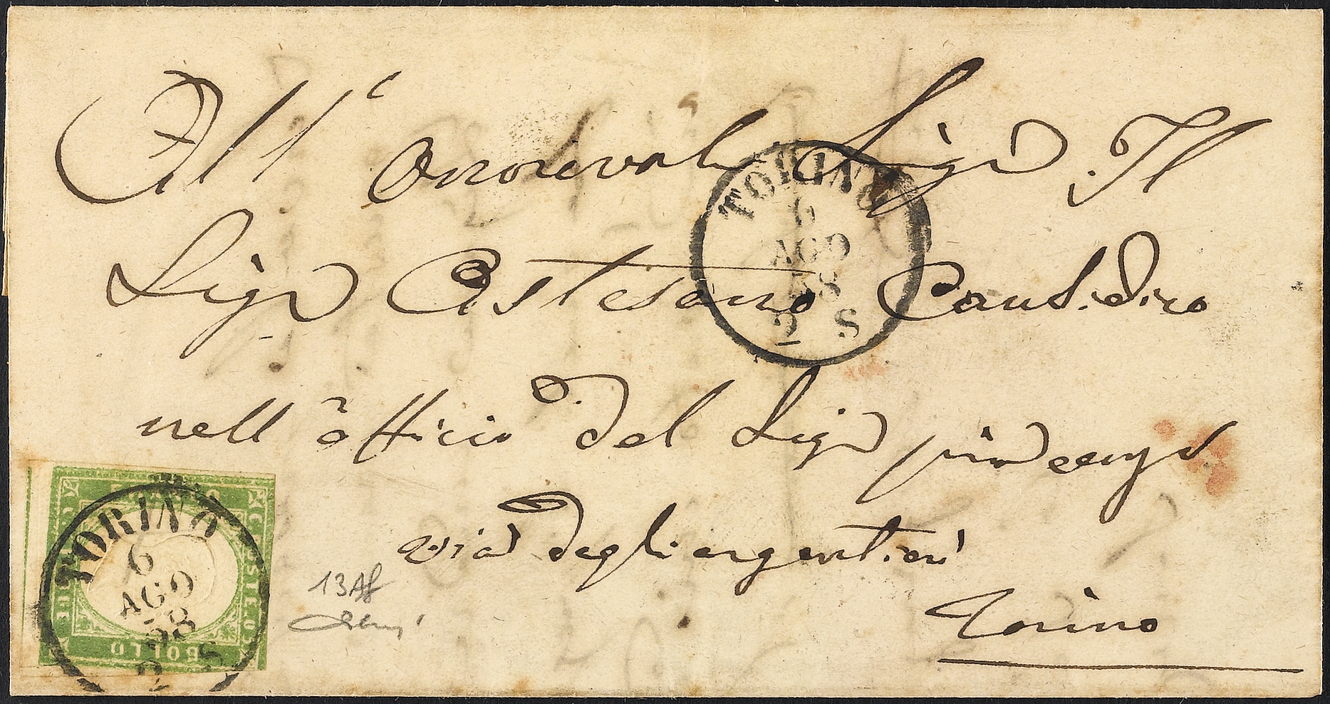 1855 - 5 c. verde giallo chiaro isolato su lettera del 6 agosto 1858 da Torino per città - Da esaminare