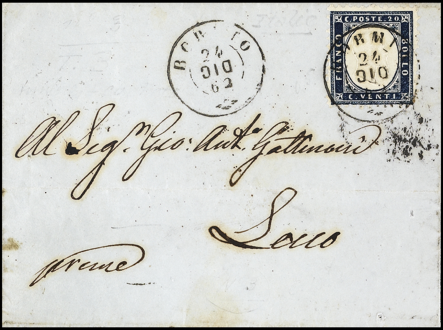 1862 - Bormio - Doppio cerchio con mese capovolto (inedito) annullatore di Regno I emissione dentellata 20 c. su lettera del 24 dicembre per Lecco