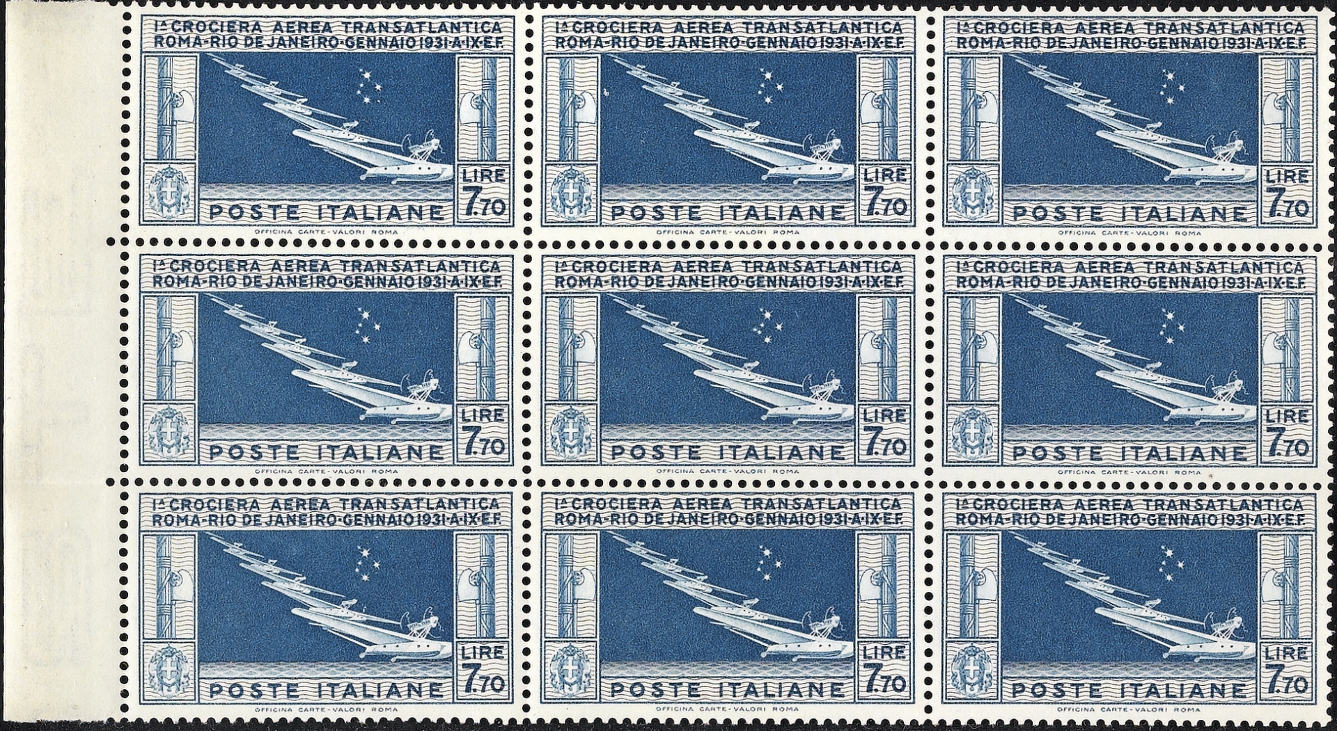 1930 - Balbo 7,70 blocco di nove bordo di foglio a sinistra con l'esemplare centrale varietà "sette stelle" - Firma G. Bolaffi