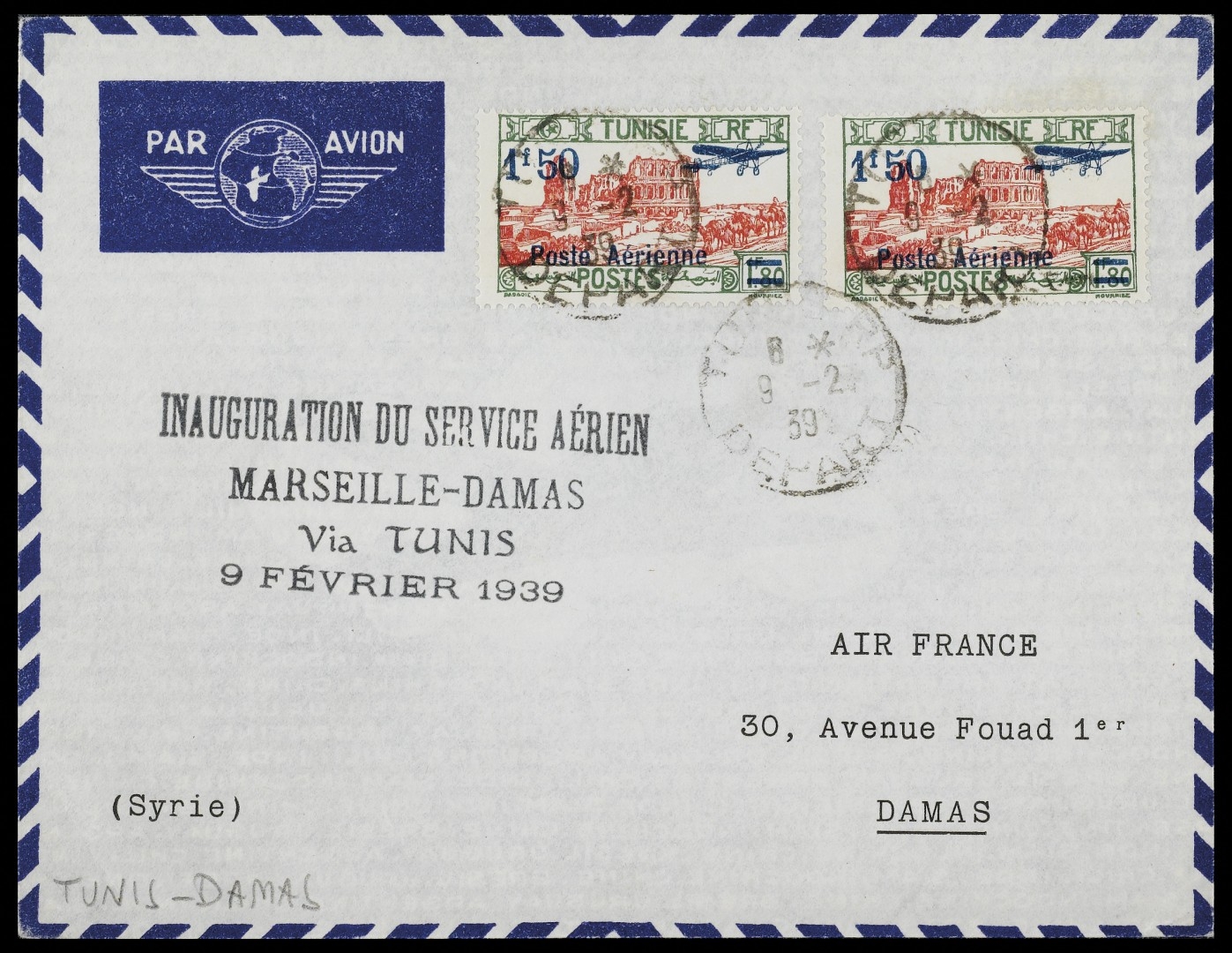 1939 - Primo volo Tunisi - Damasco  - L'aerogramma del 9 febbraio affrancato per 3 f. - Unito aerogramma del primo volo Air France Parigi - Algeri (1935) - Da esaminare