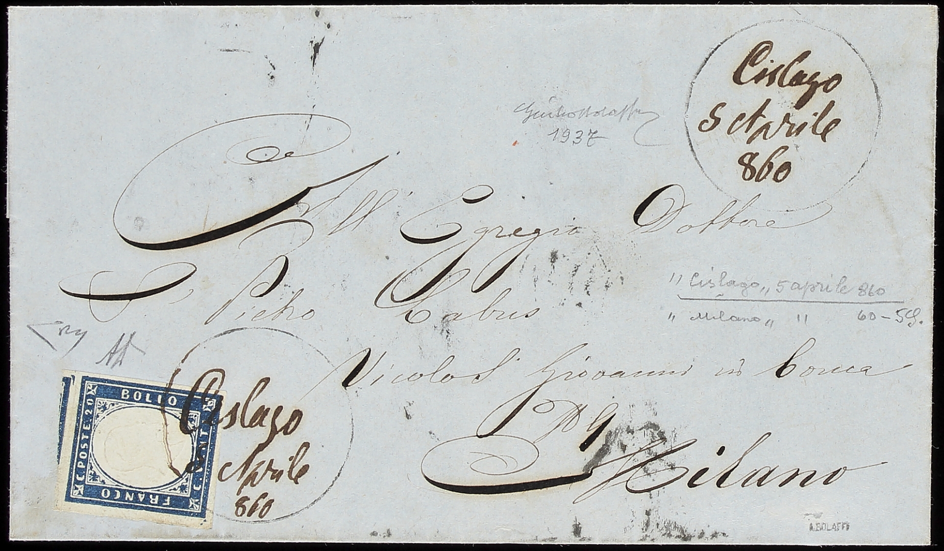 1860 - Cislago - "Grafico" provvisorio a penna in cerchio annullatore di Sardegna 20 c. e ripetuto a lato su lettera del 5 aprile per Milano - Molto rara - Cert. Diena - Firma Giulio Bolaffi
