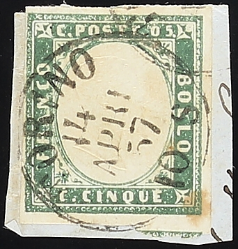 1855 - 5c. verde scuro su frammentino  - Unito 5 c. verde mirto scuro - Cert. Cardillo e Colla