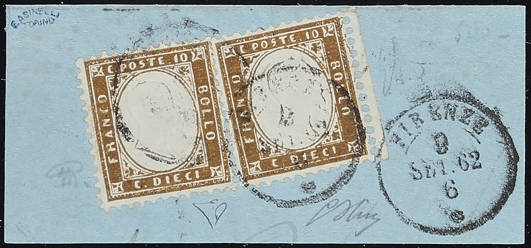 1862 - Prima emissione dentellata 10 c. bruno oliva scuro due esemplari su frammento usato a Firenze l'8 settembre 1862 - Cert. Oliva