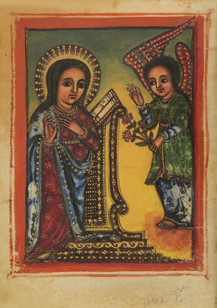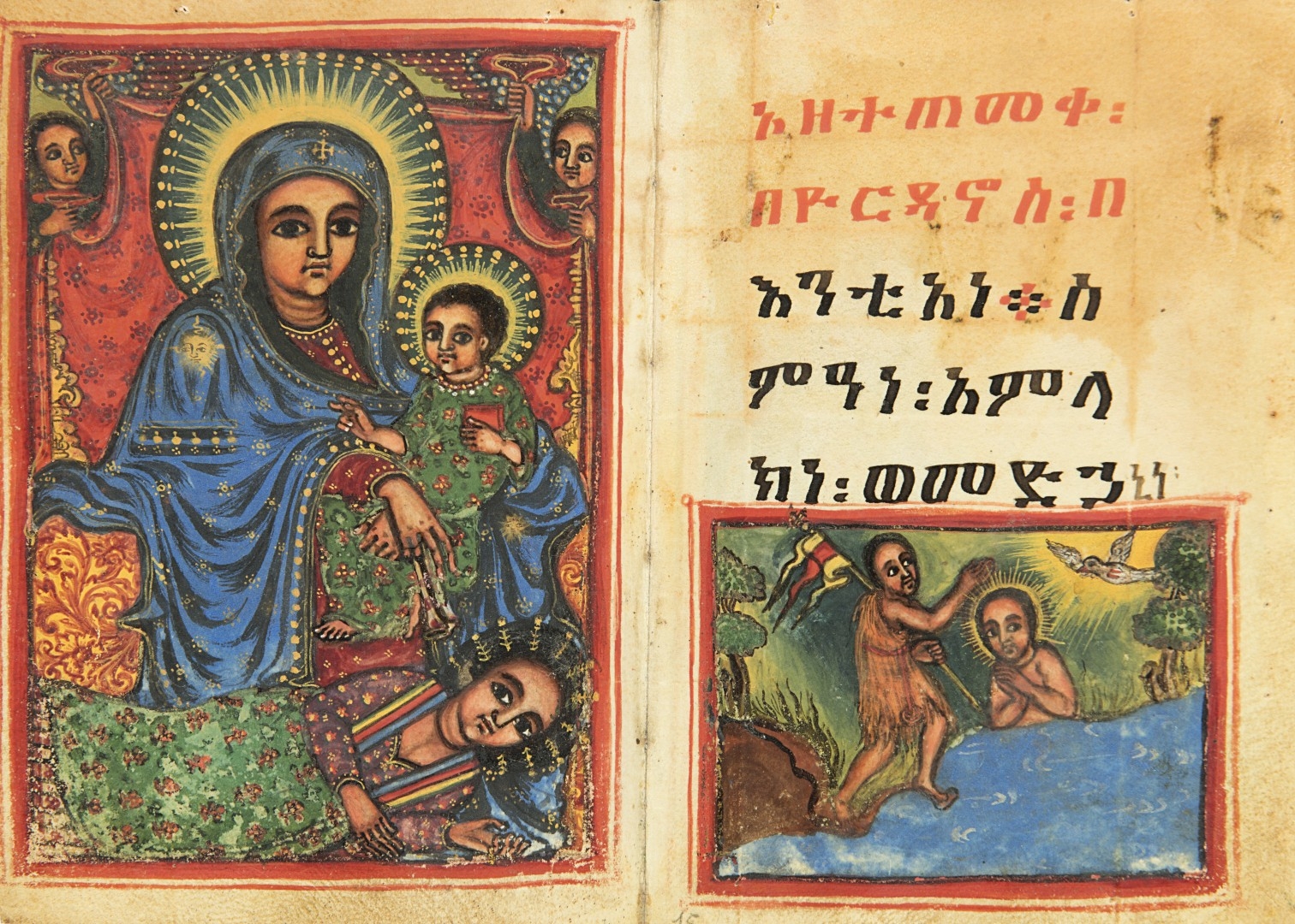 in 4° (200 x 135 mm); 110 carte. Manoscritto miniato su pergamena, testo in lingua amarica a caratteri rossi e neri, 28 miniature a piena pagina e 2 a mezza pagina (qualche difetto, piccole cadute di colore.) Legatura coeva in marocchino rosso con decorazione di ferri a secco sui piatti e al dorso liscio.