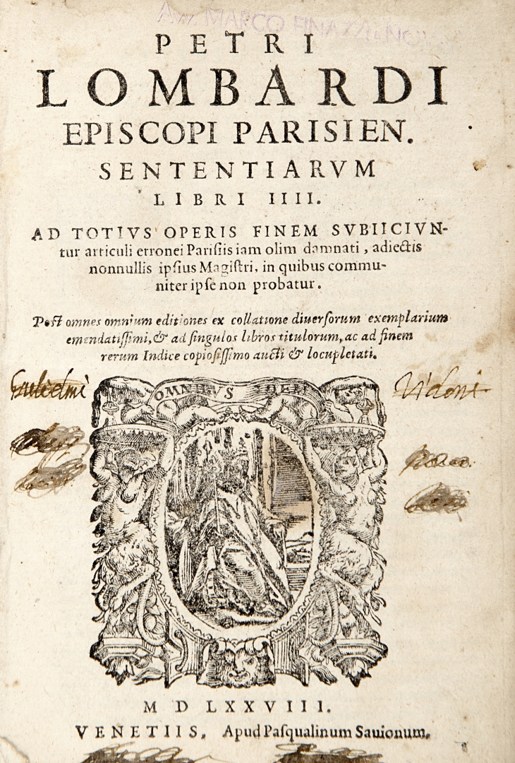 [Torrentino]. Lotto che contiene la prima edizione latina de In Quatuordecim Sancti Pauli epistolas Commentarius di Teodoreto di Cirro nell'edizione di Torrentino del 1552, e Petri Lombardi episcopi parisien. Sententiarum libri III del 1578 in legatura coeva in pergamena floscia con titolo manoscritto al taglio inferiore.