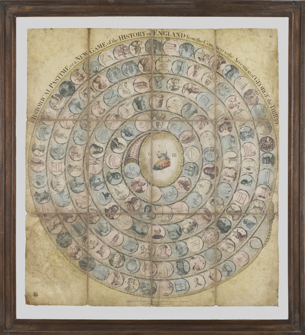 In 2° (535 x 700 mm). Litografia con coloritura coeva, entro cornice (leggeri aloni.) Gioco di 84 caselle numerate. Il "Nuovo Gioco della Vita Umana" è una versione del Gioco dell'Oca estesa a 84 caselle in modo da rappresentare le sette età dell'uomo ciascuna costituita da 12 anni. Ciompi & Seville 144. Nel lotto anche Historical pastime or a New game of the history of England from the conquest to the accession of George the Third, litografia con coloritura coeva, stampata a Londra da J. Harris nel 1803. Ciompi & Seville 2316.