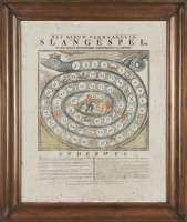 [Olanda]. Het Nieuw Vermaakelyk Slangespel. In 2° (610 x 495 mm). Xilografia di A. Bouwens, stampata nel 1790 circa ad Amsterdam da De Erve H. Rynders, con coloritura coeva, entro cornice (piccole mancanze.) Rarissimo gioco olandese conosciuto anche con il sottotiolo "anders genaamd Koninglyketydkorting van Cupido". Nel lotto anche Het stroomboots Spel, xilografia con coloritura coeva, stampata nel 1830 circa, con indicazione in alto "Rotterdam en Dordt", Het nieuw vermakelijk ganzen-spel del 1820 circa, Als gy dees nieuwe wereld ziet nell'edizione di Amsterdam di David le Jolle, stampata tra il 1794 e 1804 circa, e Het nieuw vermakelijk Ganzenspel.