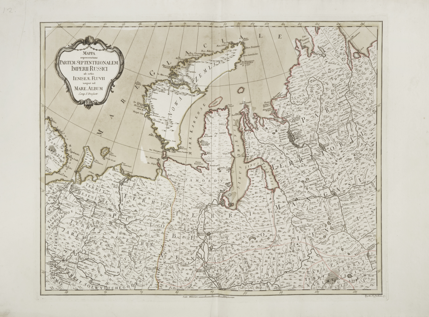 [Russia]. Mappa representans partem septentrionalem Imperii Russici di Iwan (Johann) Fomitsch Treskot (anche nella variante Truskot, 1719-1786) del 1772 in acquerellatura coeva (550 x 770 mm). La carta geografica fa parte della mappatura dell'Impero Russo realizzato sotto il regno di Caterina la Grande.