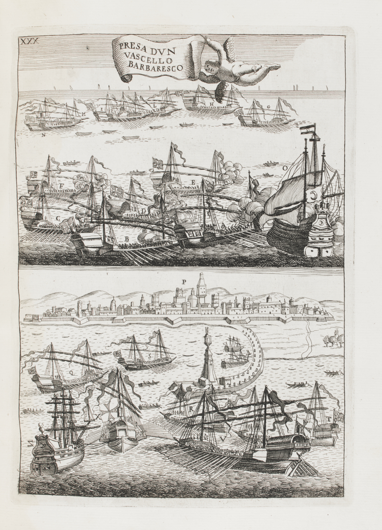 In 2° (315 x 230 mm); [10], 260, xxiii, [1] pagine. Antiporta con trionfo delle armi di Cosimo III dedicatario dell’opera, ritratto a piena pagina del duca inciso da Theodor Verkruys, 37 tavole in rame raffiguranti soggetti navali a piena pagina intercalate nel testo e numerate I-XXXVII (piccolo foro di tarlo al margine interno di poche carte finali, leggero alone al margine interno.) Legatura coeva in pergamena con titolo manoscritto al dorso.