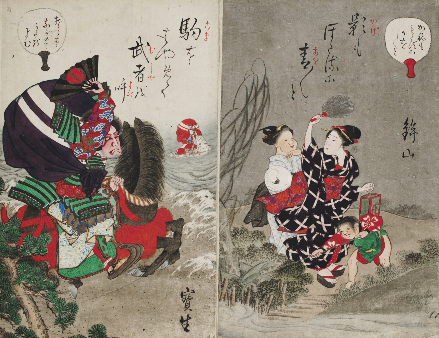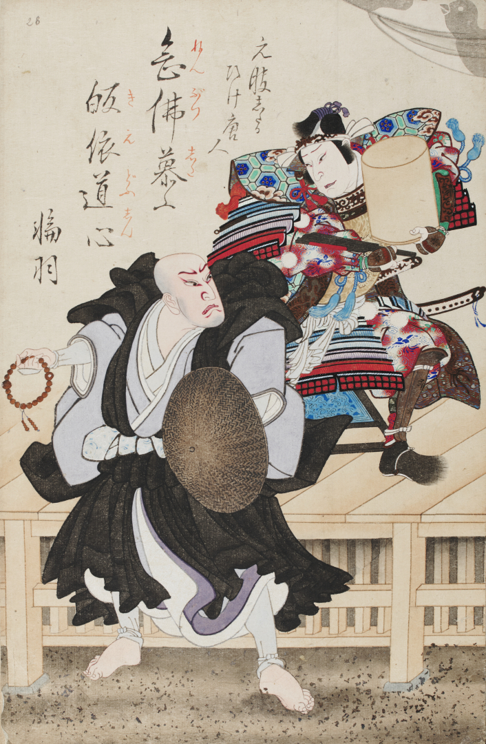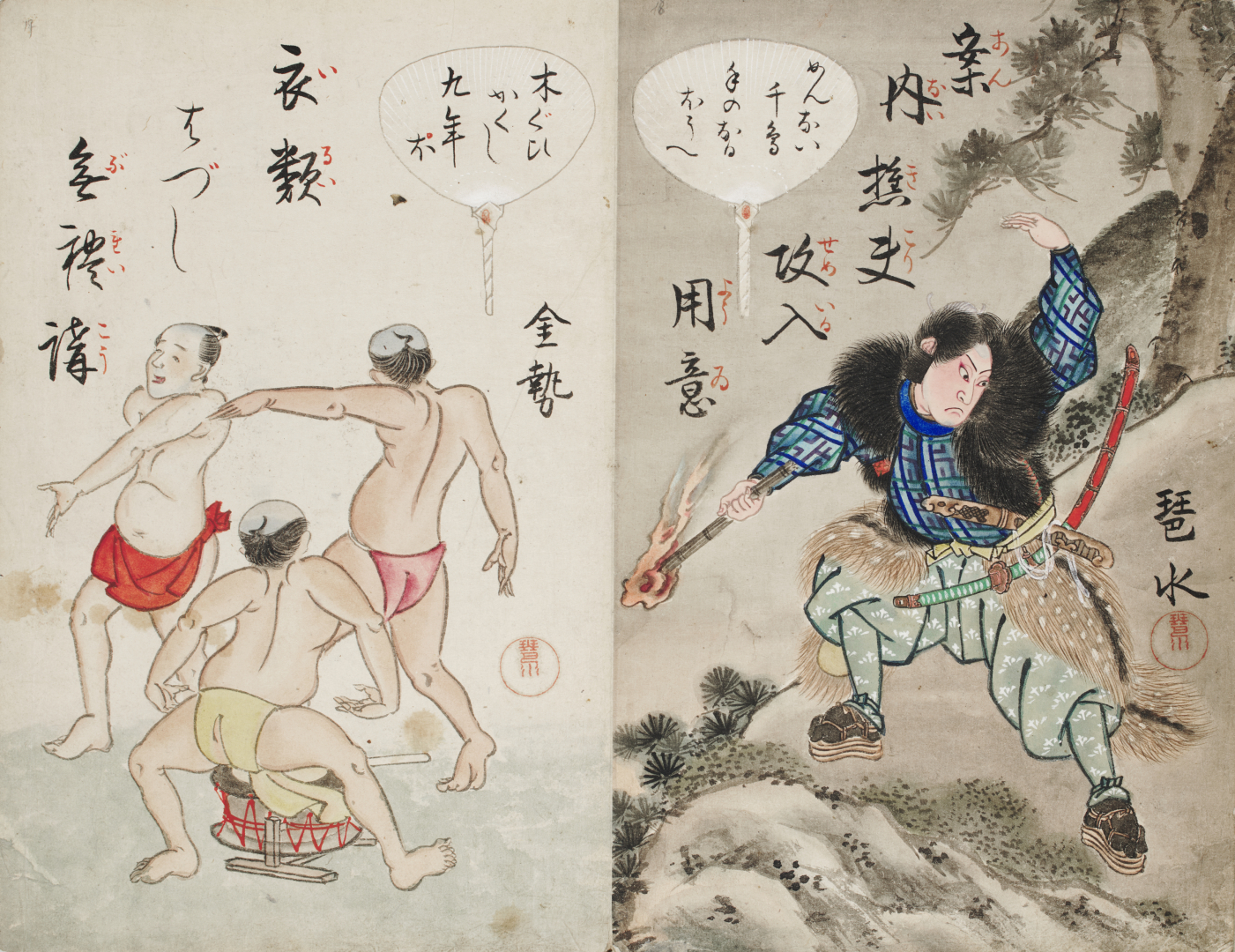 Utagawa Kunisada , ed altri. Libro giapponese Album in 2° (358 x 232 mm), Giappone, secolo XIX, composto da 42 xilografie dipinte comprendenti 34 scene e 8 fogli di testo descrittivo, entro legatura in tela blu. Le scene sono a carattere miscellaneo, privo di un nesso continuativo: paesaggi, attori di teatro nelle caratteristiche pose guerriere enfatizzate, scene familiari, gruppi di lottatori. In apertura sigilli degli artisti che danno come autore Ukio Ryukosai e Yamada Kakashi.